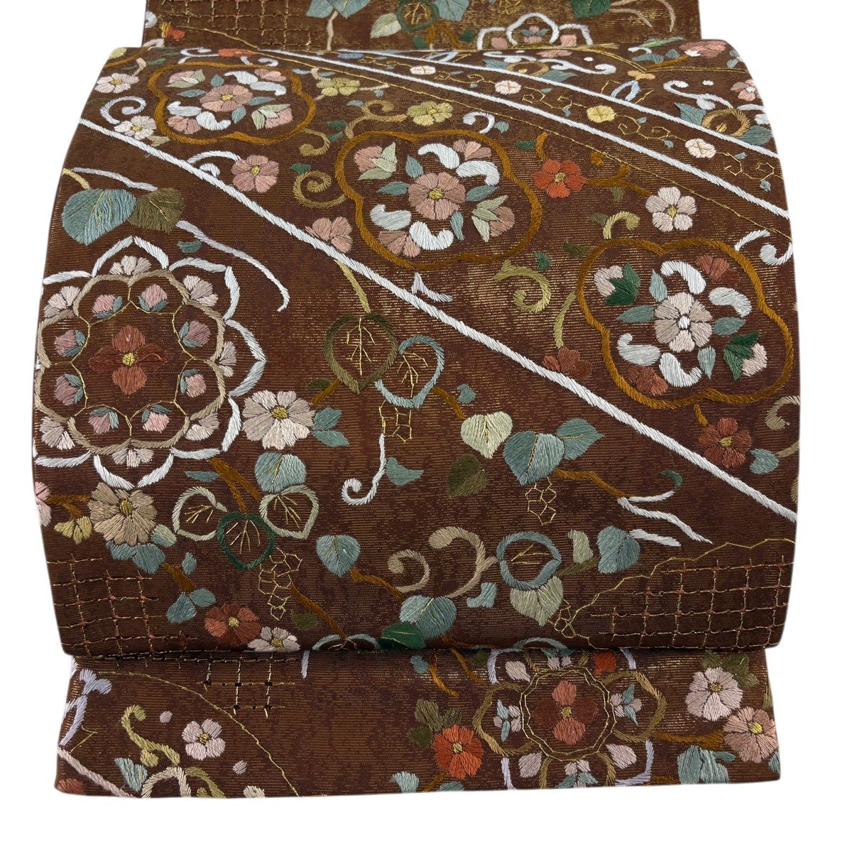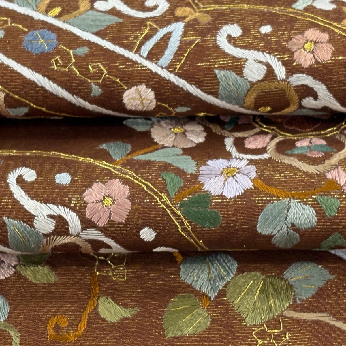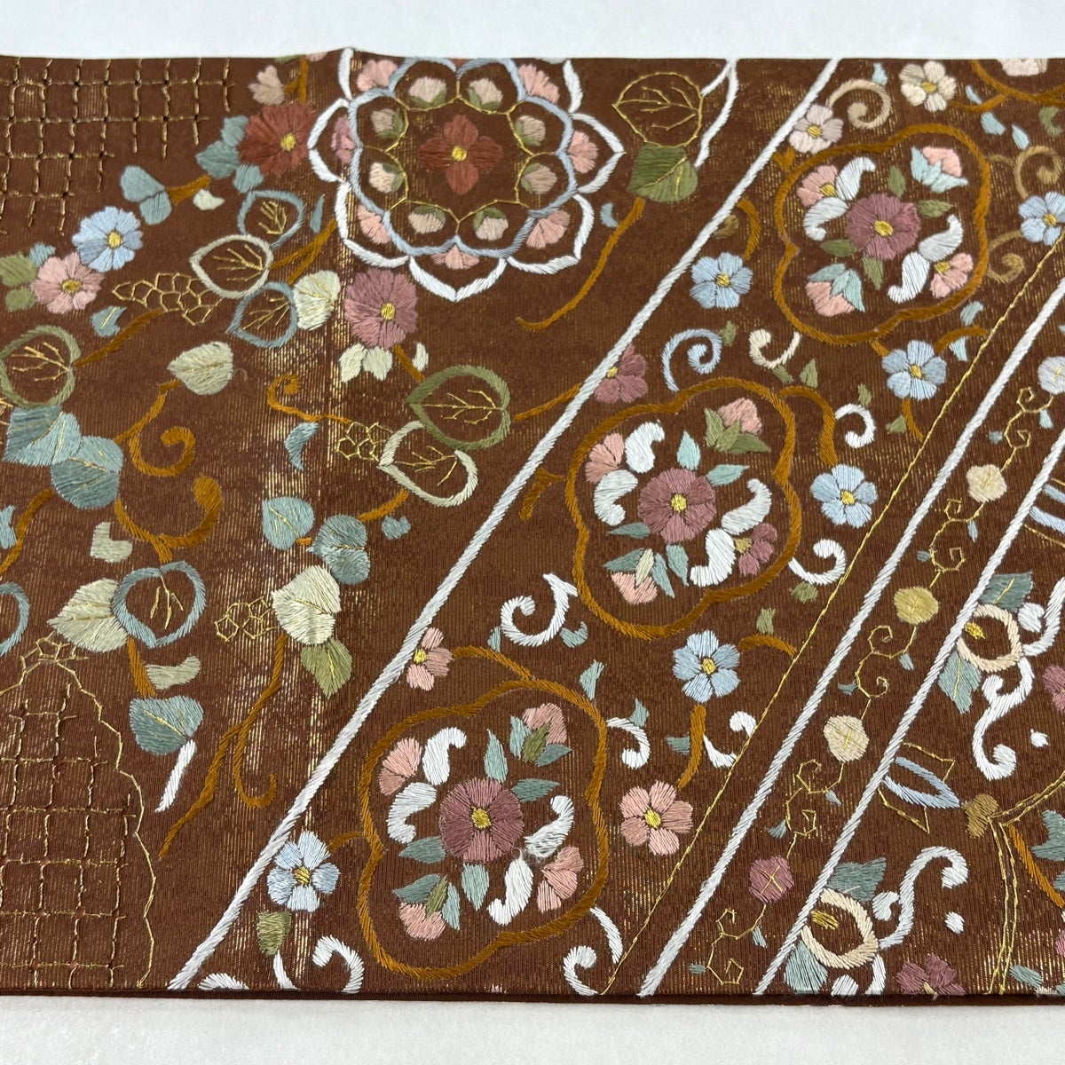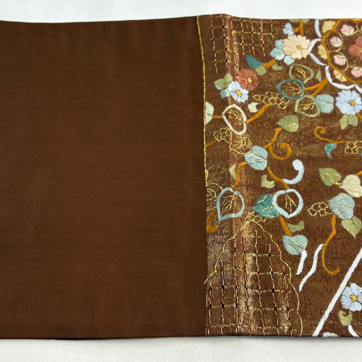 袋帯 逸品 華文 花唐草 金糸 刺繍 茶色 六通 正絹