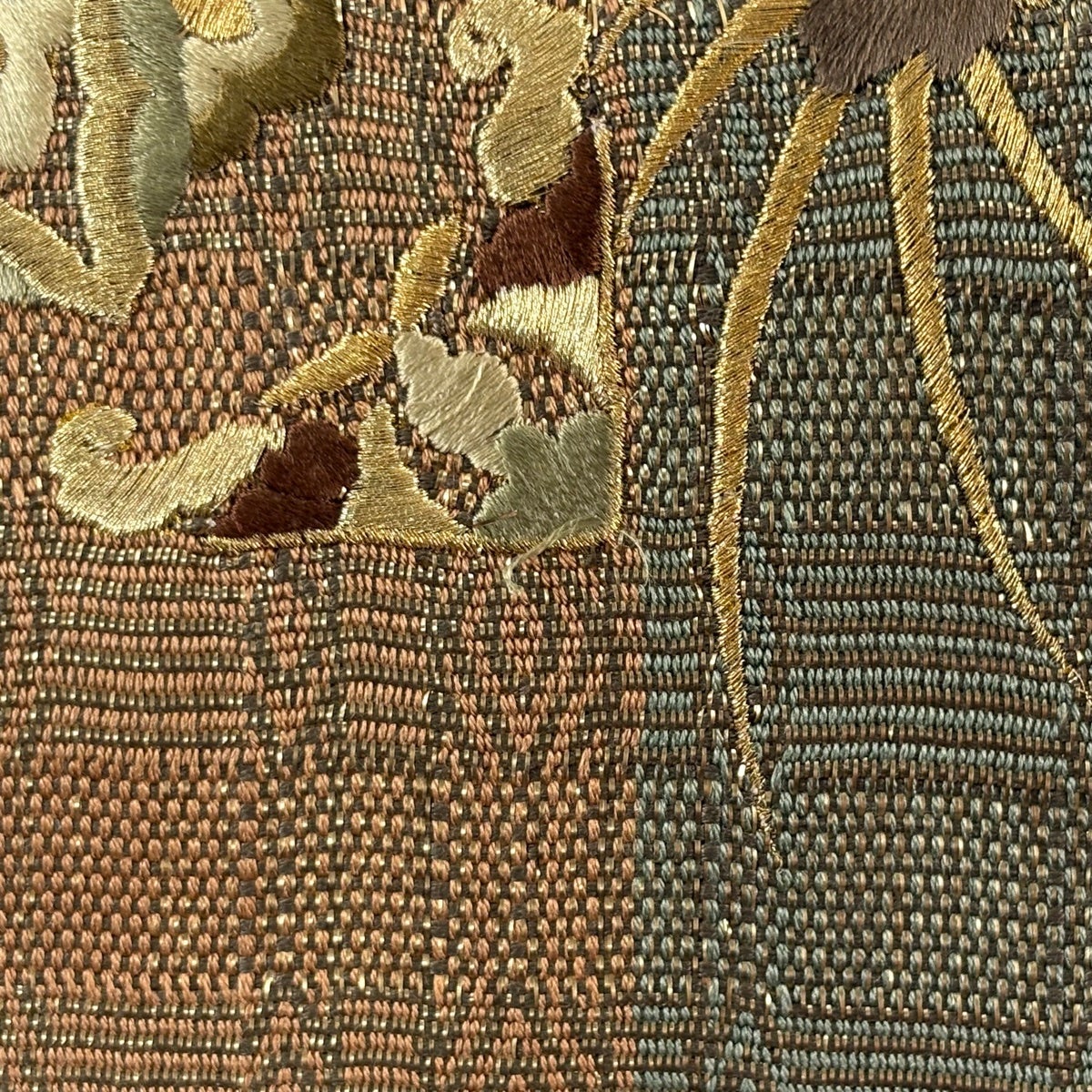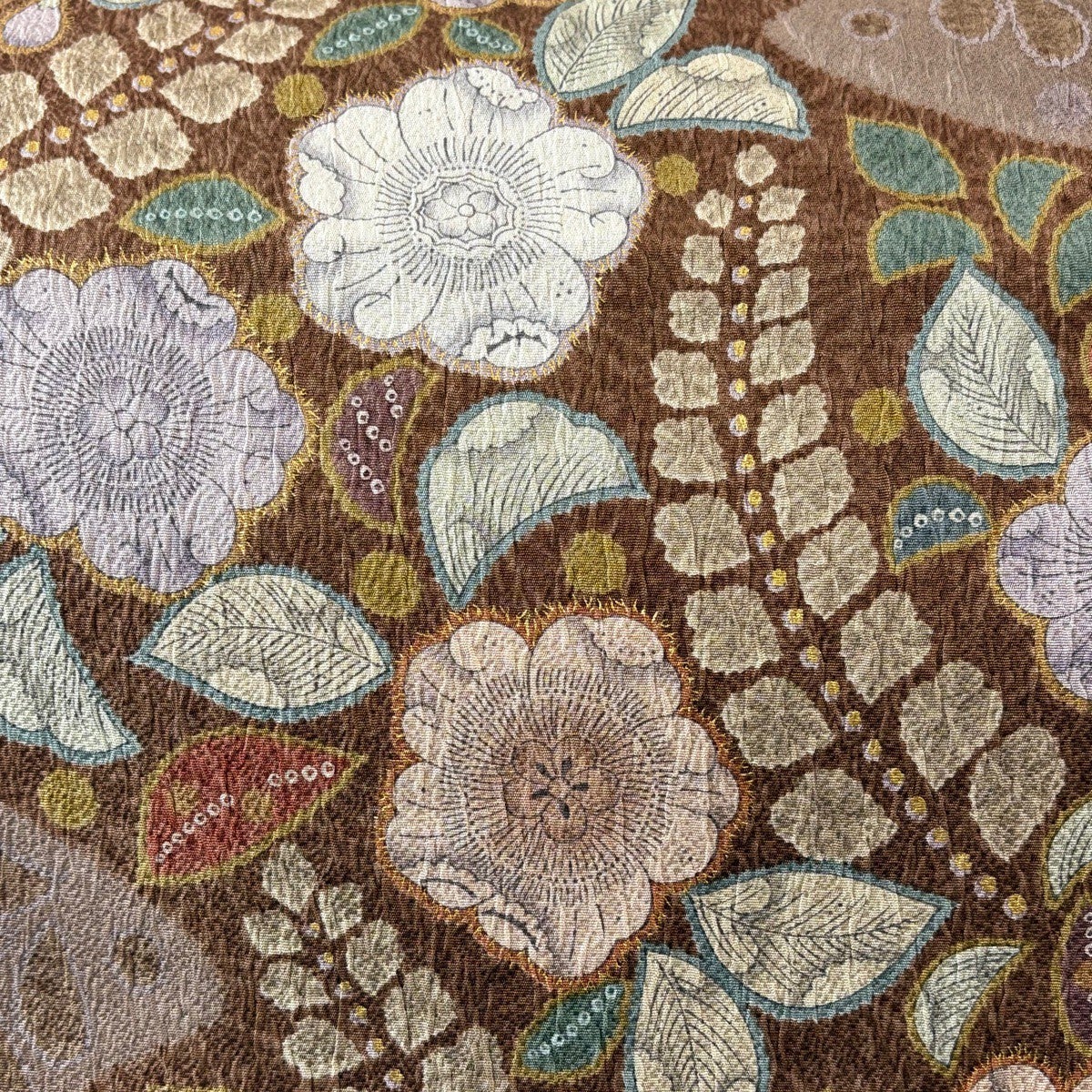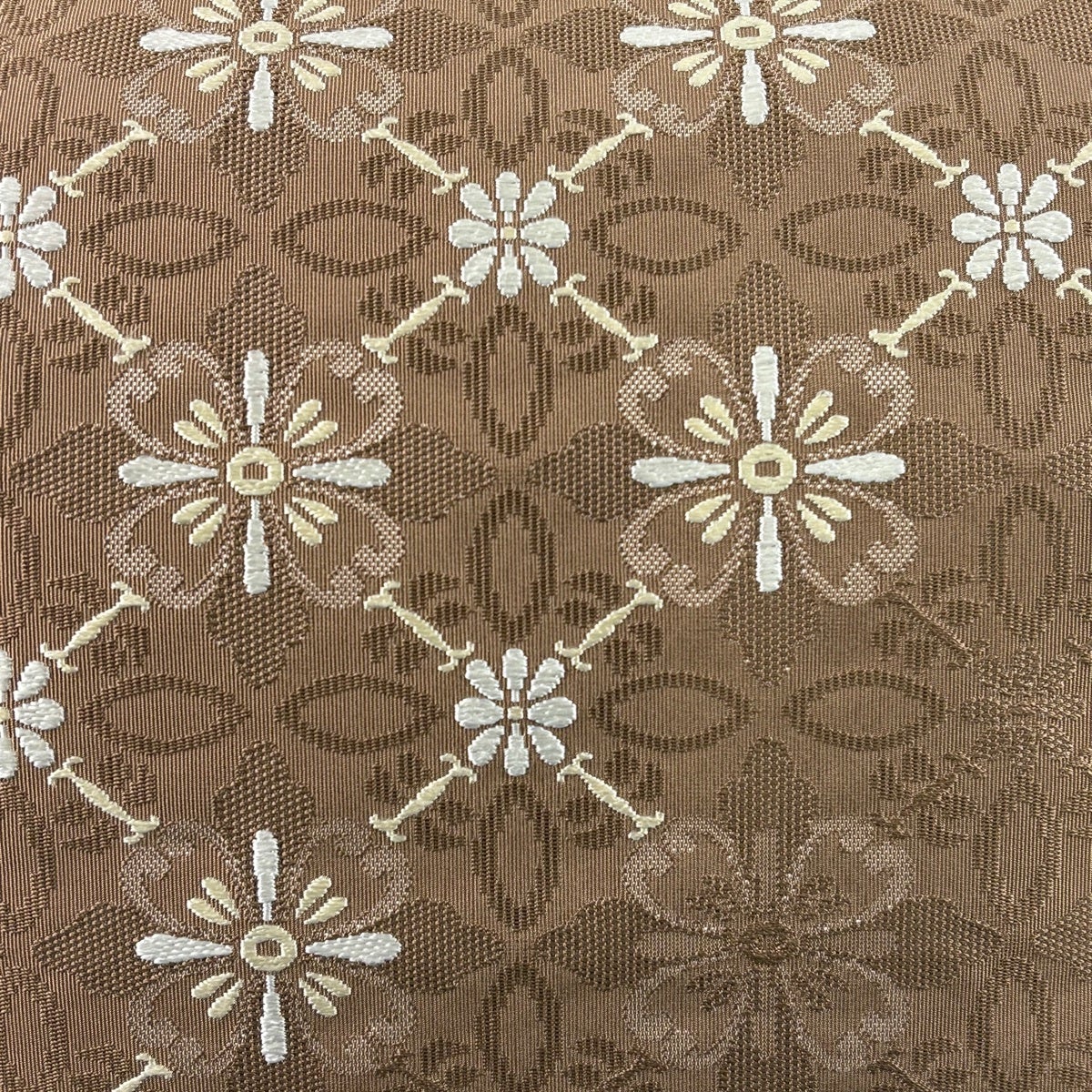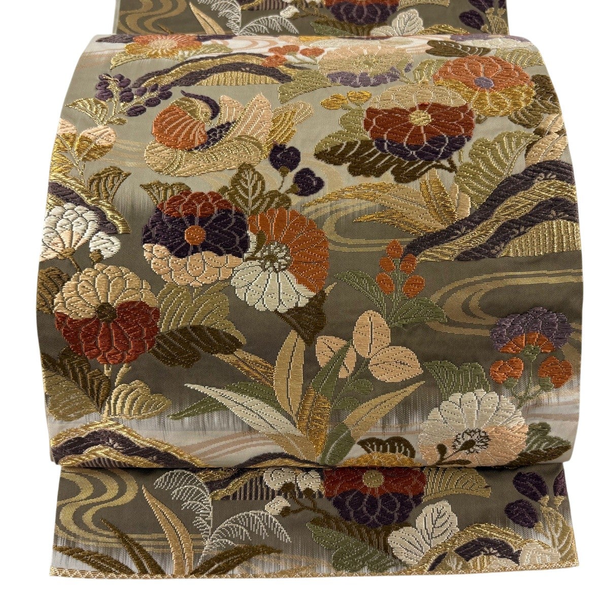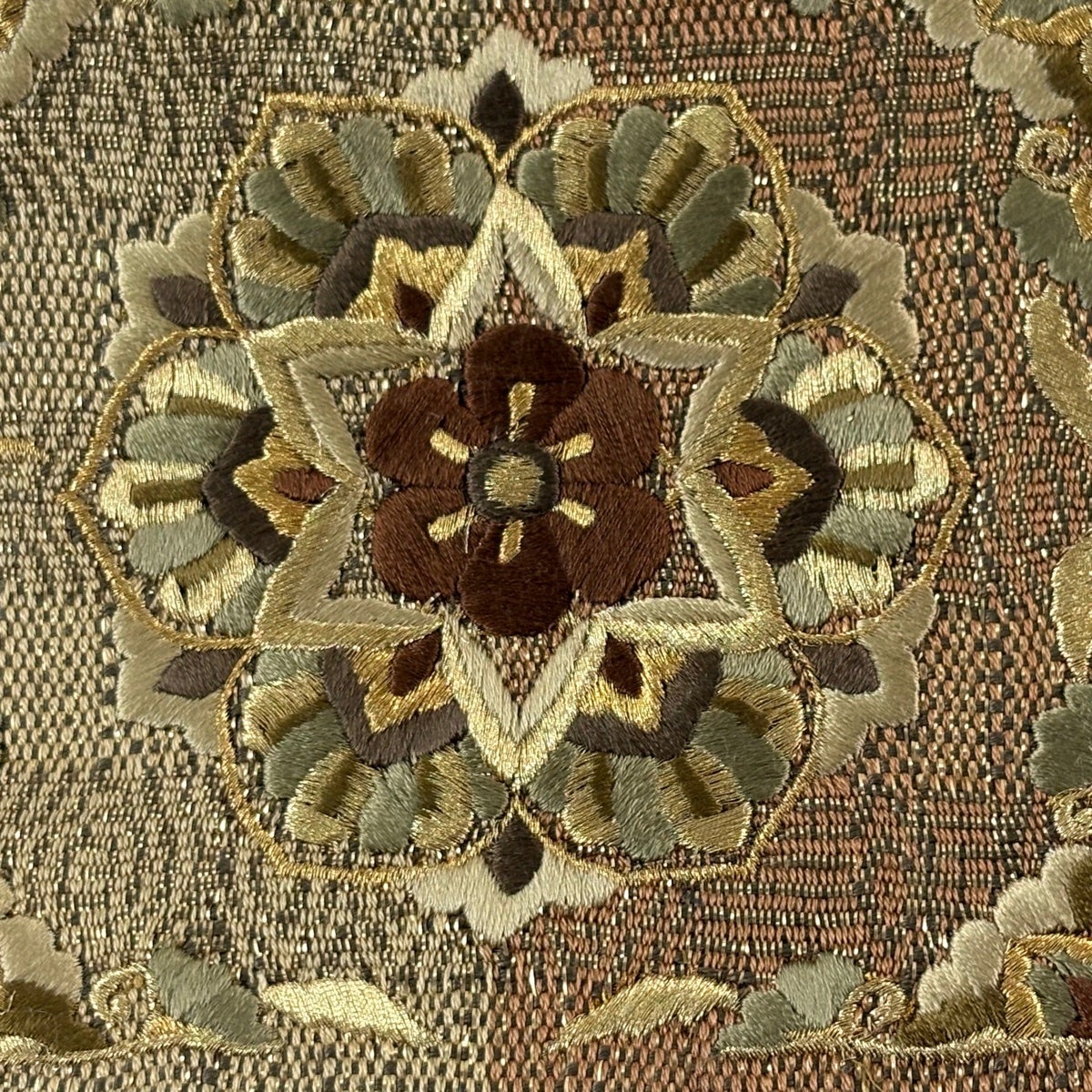 袋帯 逸品 華文 花唐草 金糸 刺繍 茶色 六通 正絹