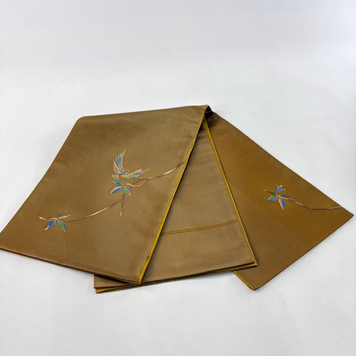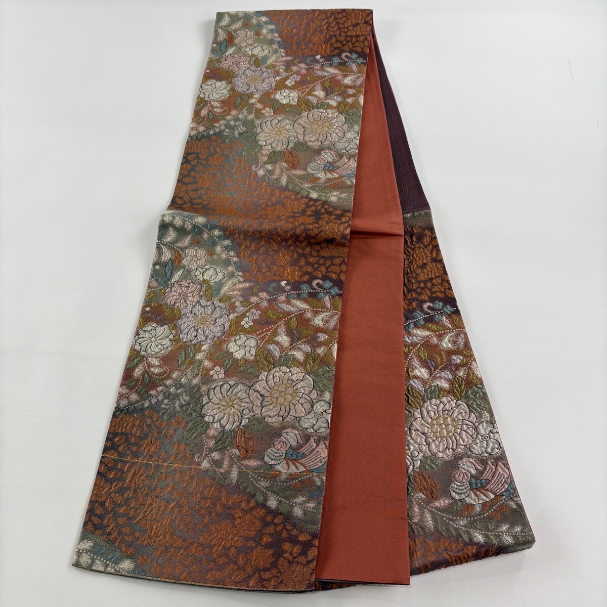袋帯 秀品 関西仕立て 草花 鳥 金糸 茶色 六通 正絹