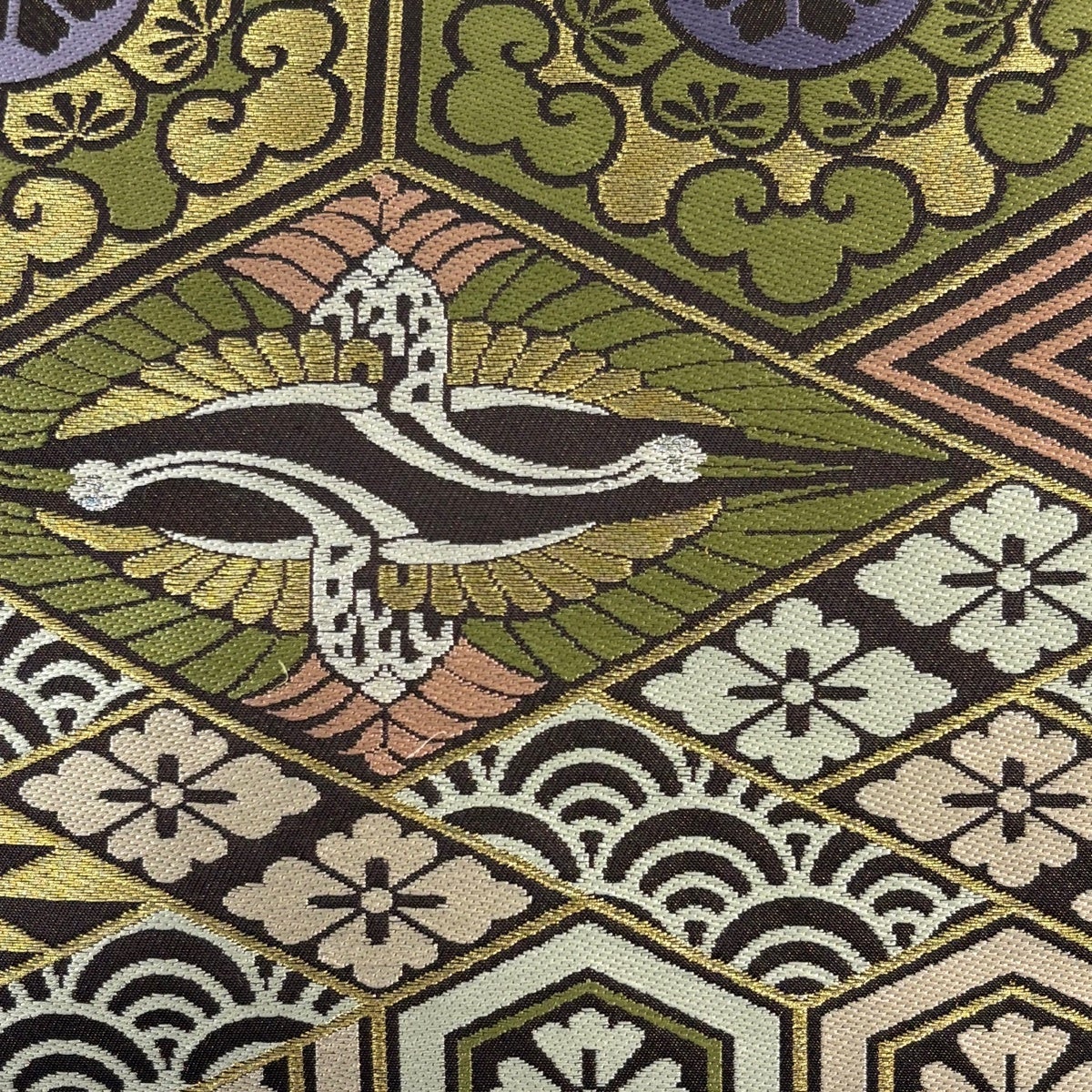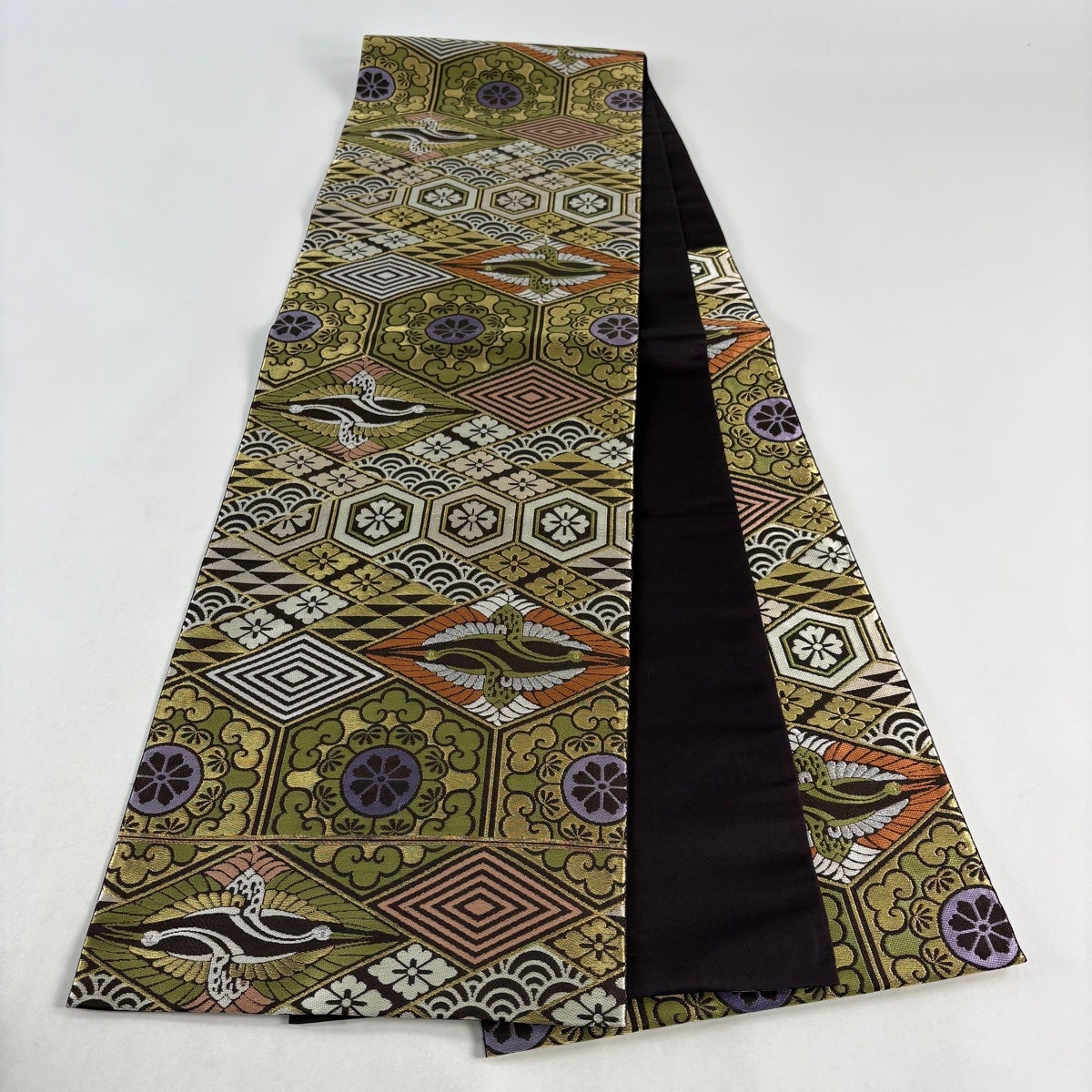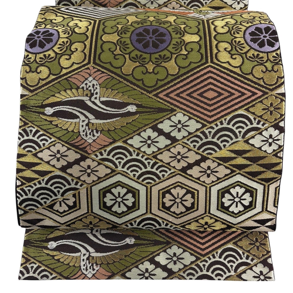 【美品】 袋帯 名品 華文 鳥 金銀糸 茶色 六通 正絹