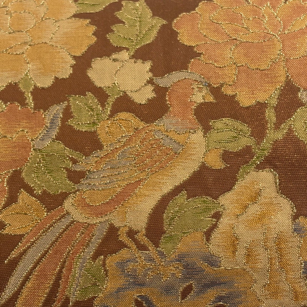 【美品】 名古屋帯 優品 牡丹 鳥 金糸 箔 茶色 正絹