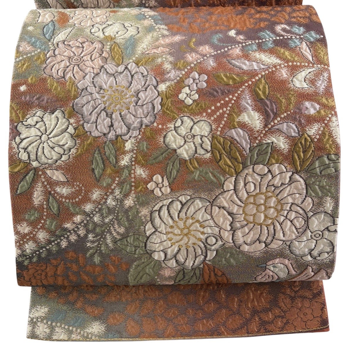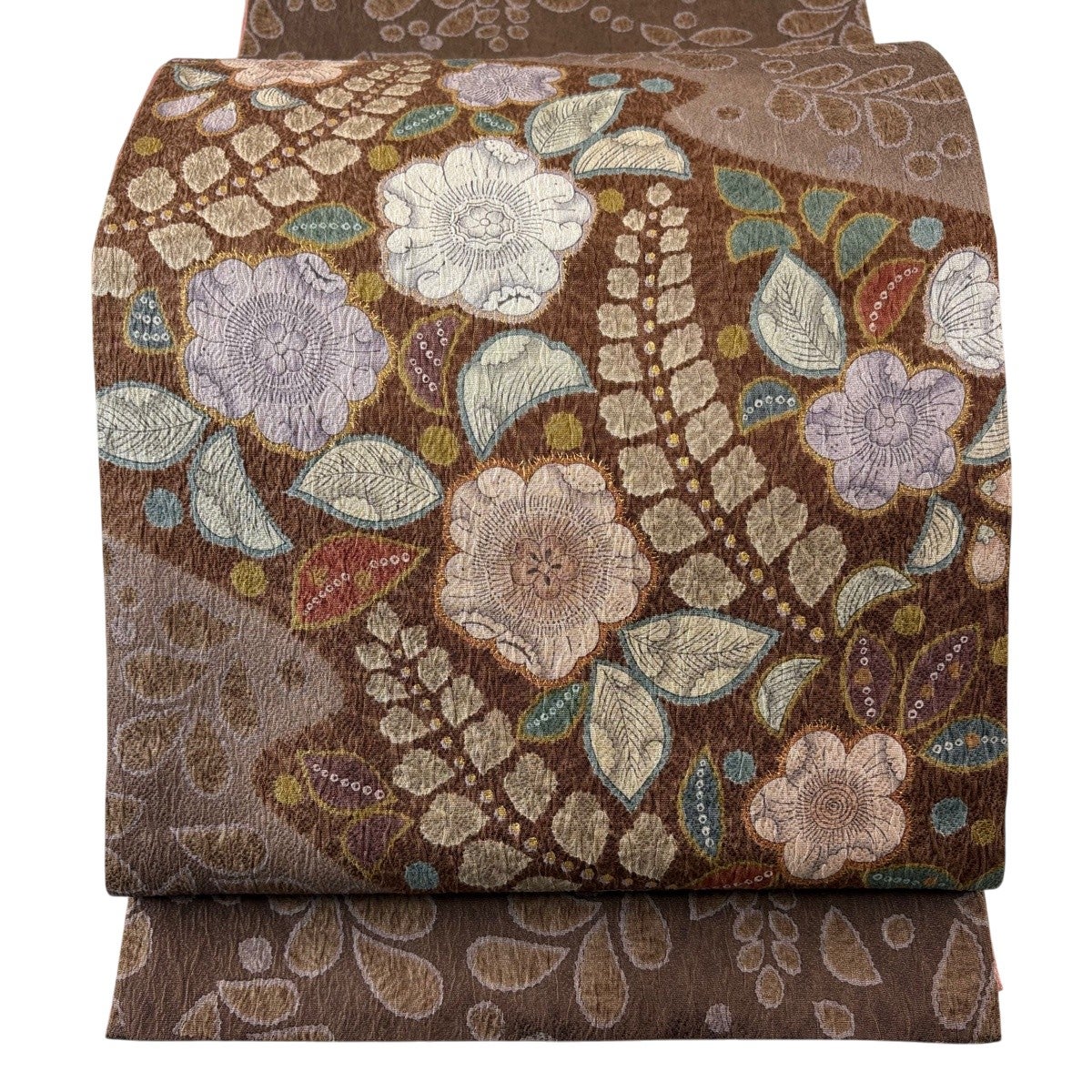 袋帯 秀品 関西仕立て 草花 箔 茶色 お太鼓柄 正絹