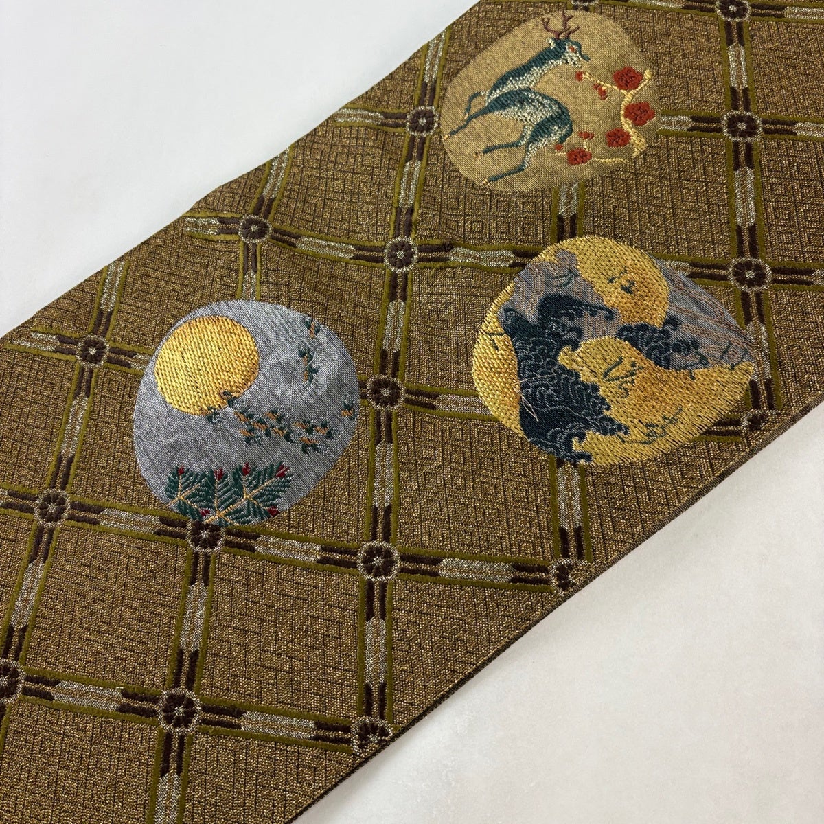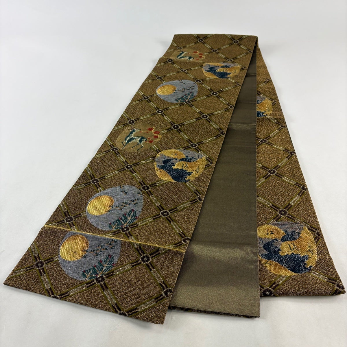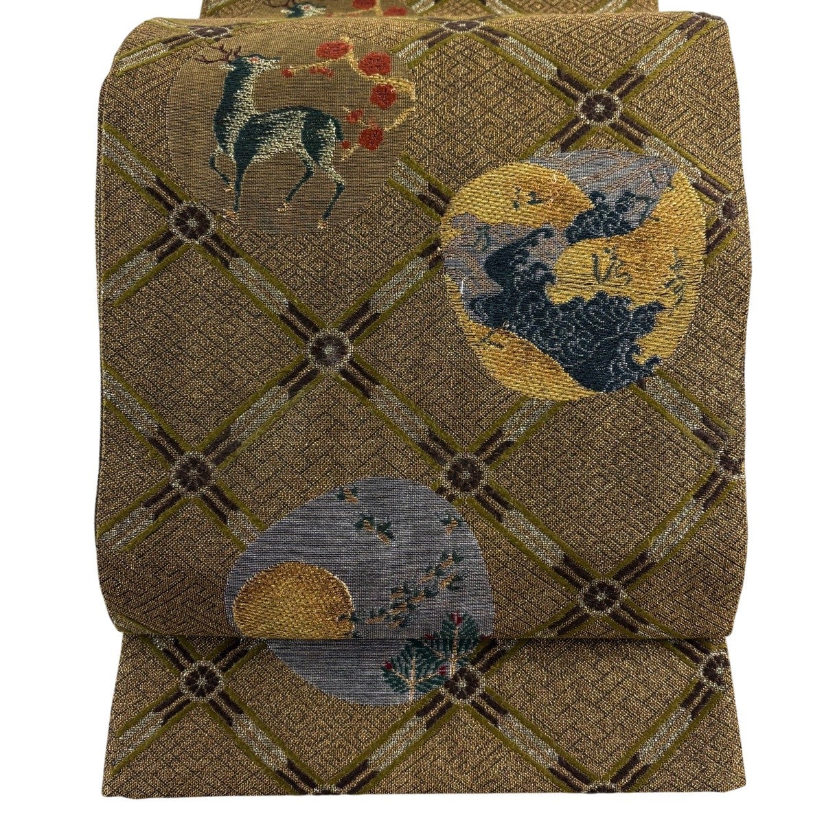 名古屋帯 秀品 夏帯 狩猟文 花鳥 金銀糸 茶色 正絹