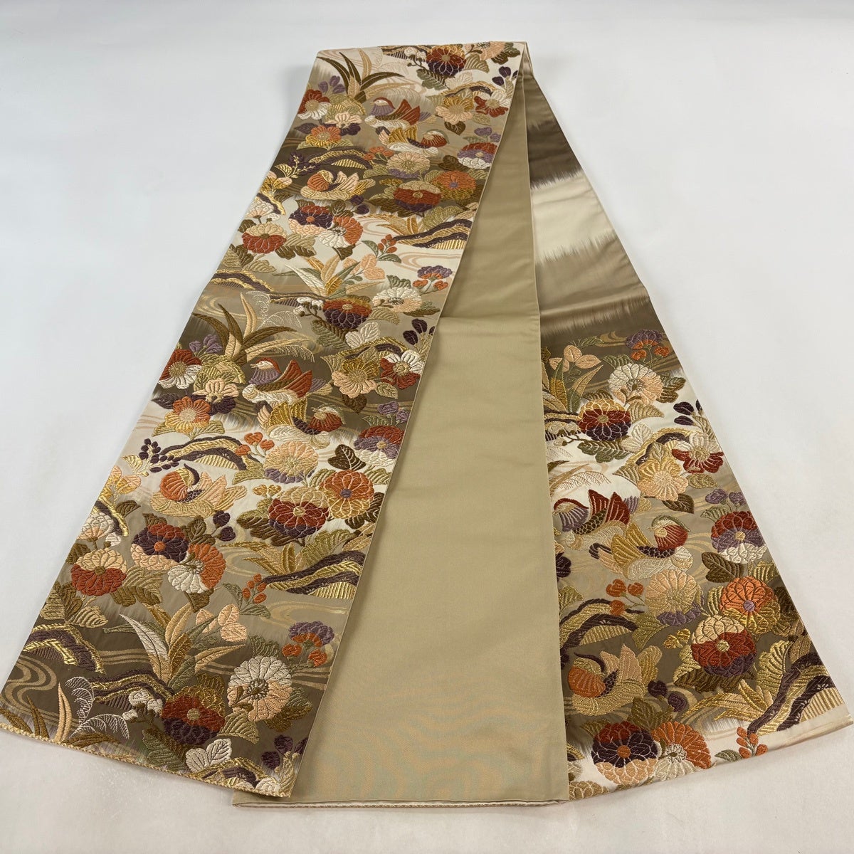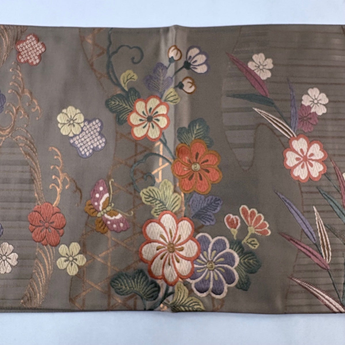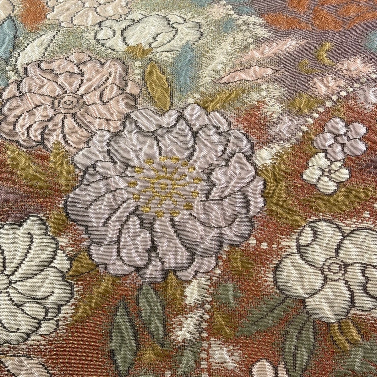 【美品】 袋帯 秀品 反物 花 金糸 茶色 六通 正絹
