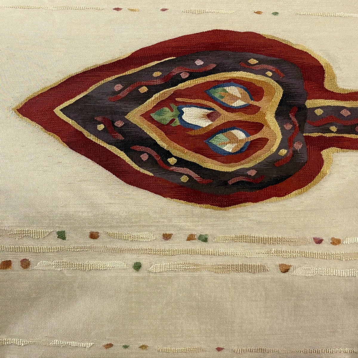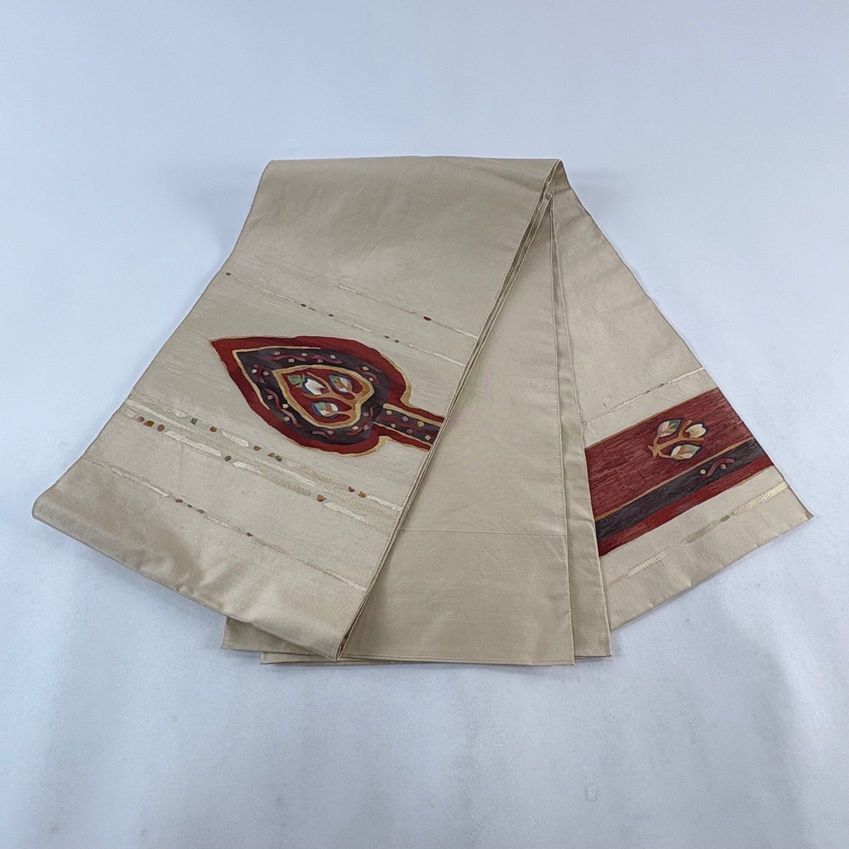 袋帯 秀品 葉柄 幾何学 薄茶色 お太鼓柄 正絹