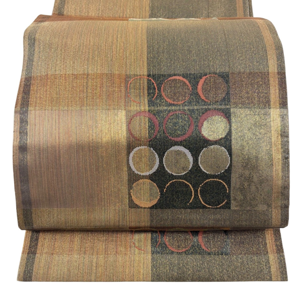 袋帯 秀品 幾何学 縞 金糸 箔 薄茶色 六通 正絹