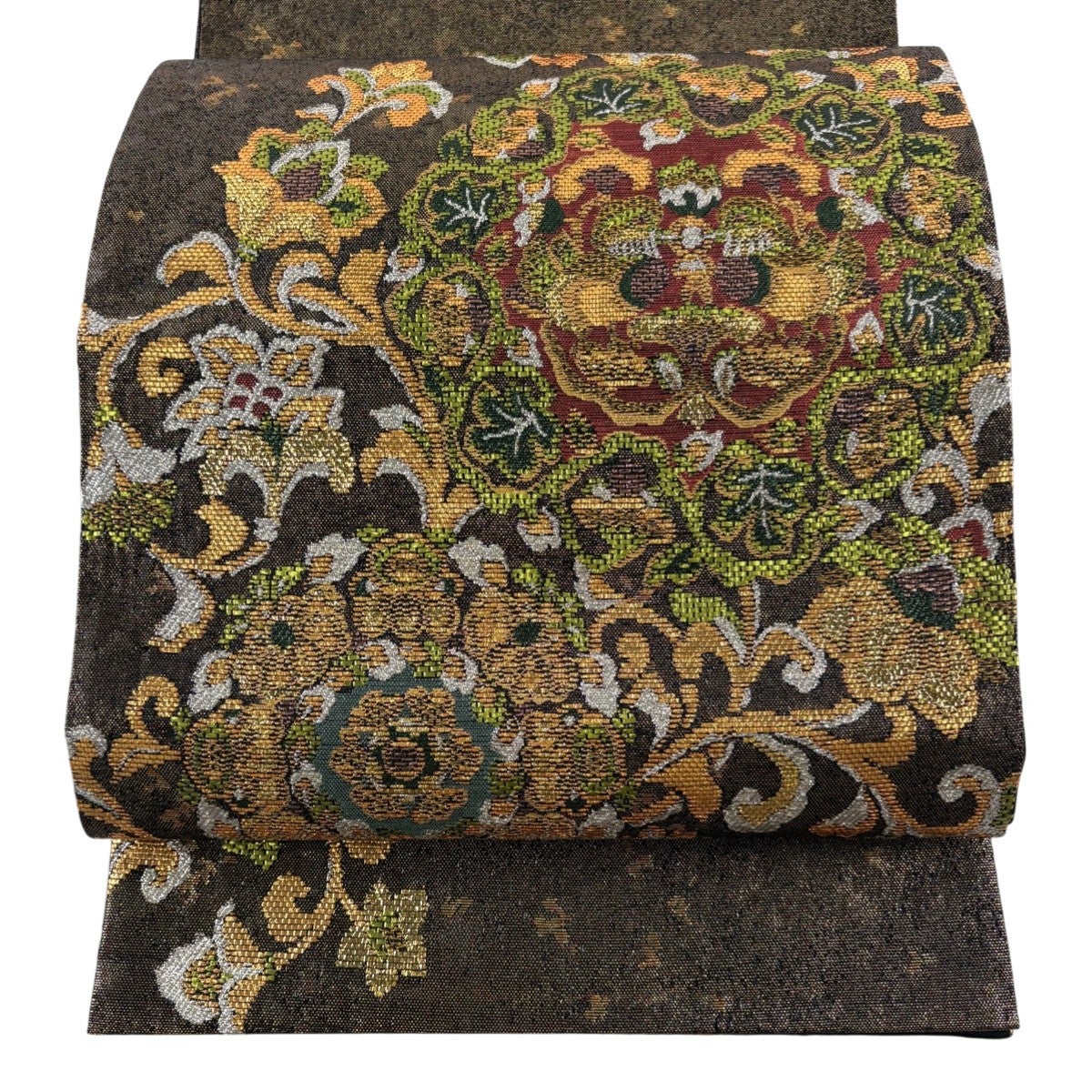 袋帯 名品 草花 霞 唐織 金糸 茶色 六通 正絹
