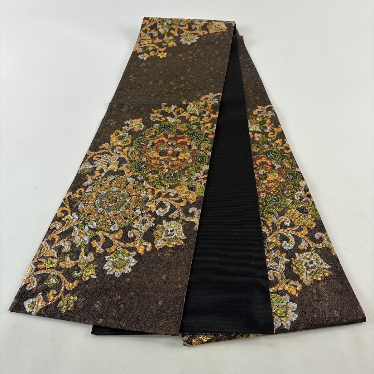 袋帯 名品 華文 花唐草 箔 茶色 お太鼓柄 正絹