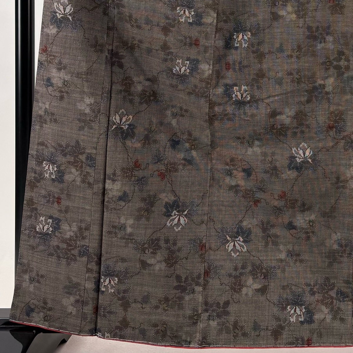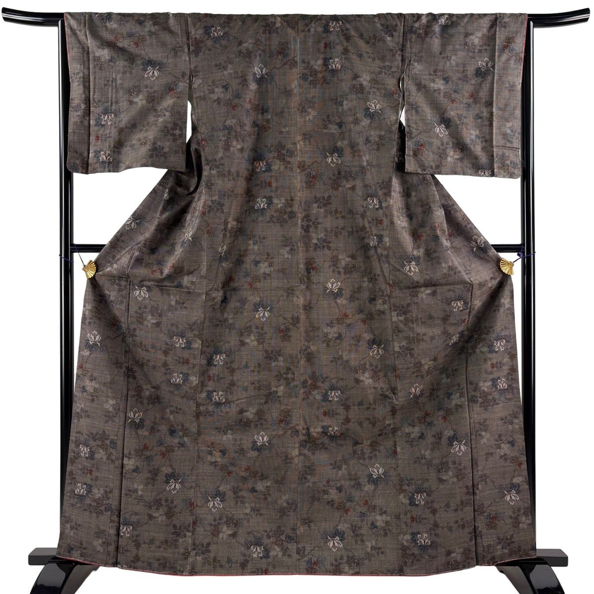 【美品】 紬 身丈163cm 裄丈64cm M 単衣 花唐草 焦茶色 正絹 秀品