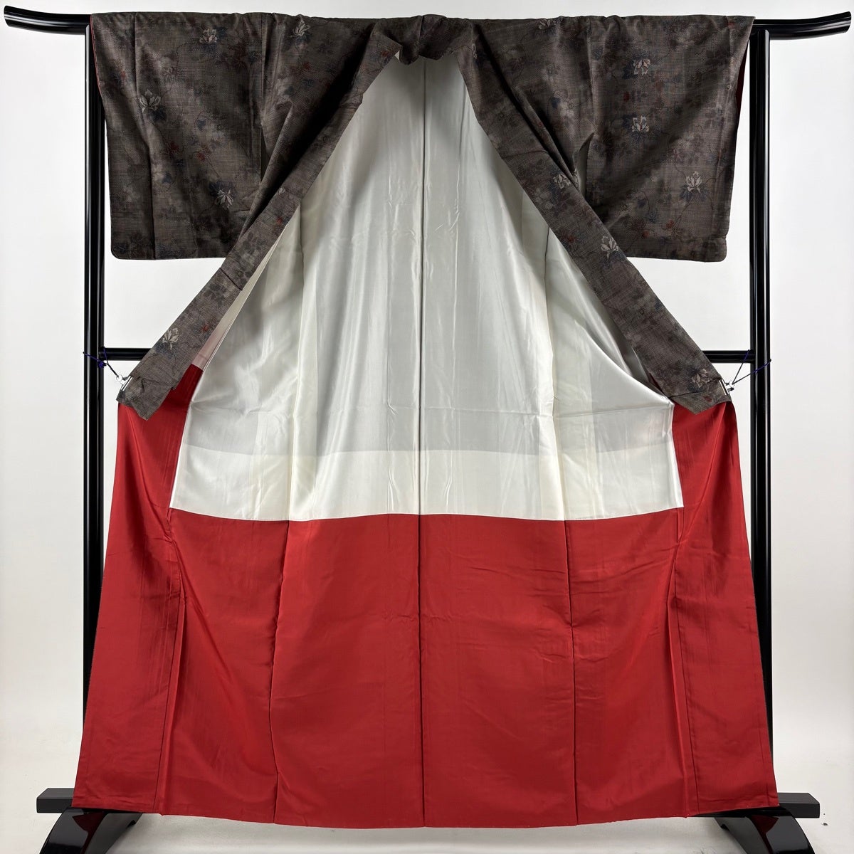 【美品】 紬 身丈156.5cm 裄丈62.5cm S 袷 草花 焦茶色 正絹 秀品