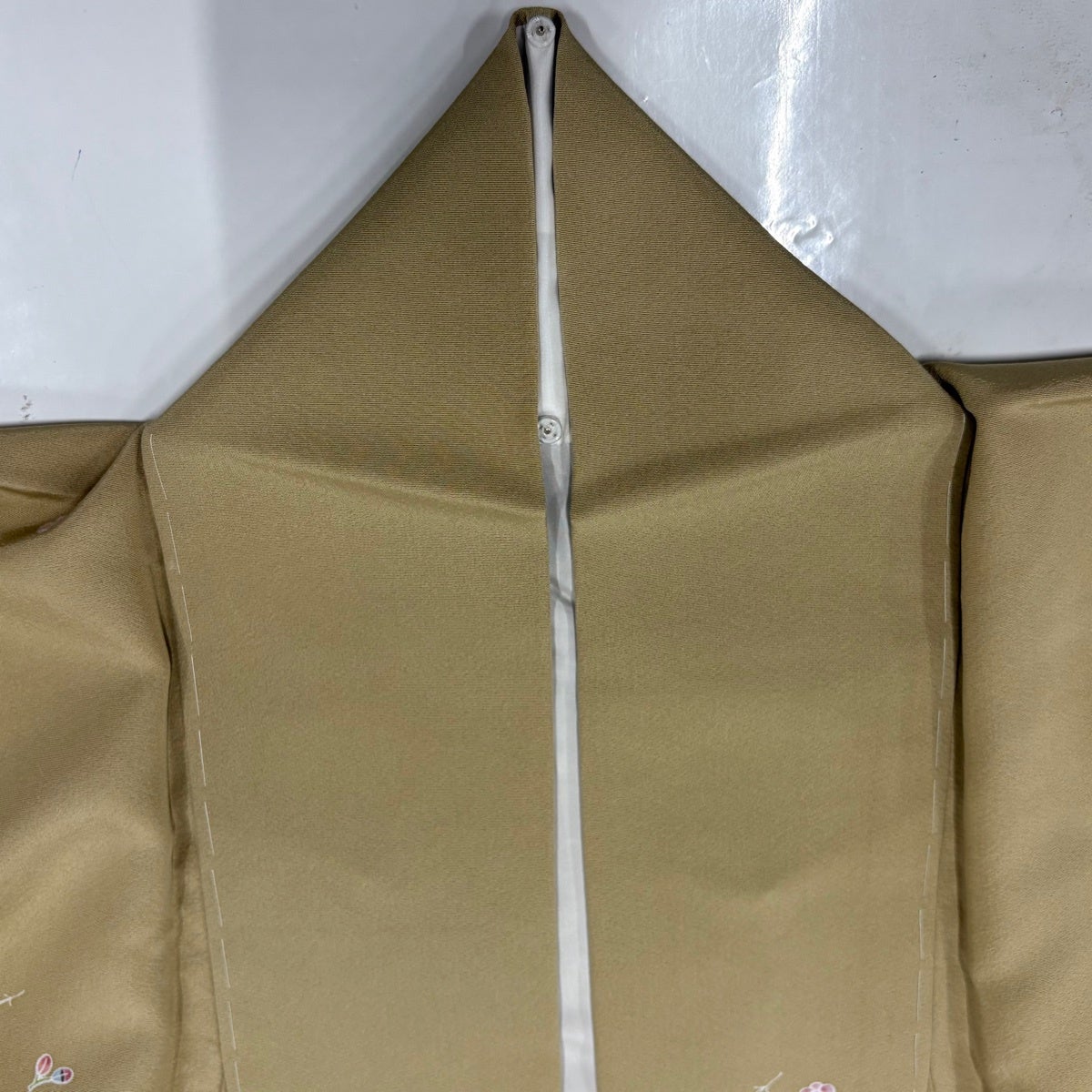 振袖 身丈161.5cm 裄丈67cm M 袷 草花 鳥 染め分け 山吹茶色 正絹 名品