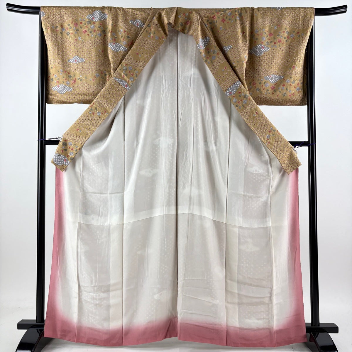 振袖 身丈157cm 裄丈61.5cm S 袷 御所車 草花 金糸 金彩 薄茶色 正絹 秀品