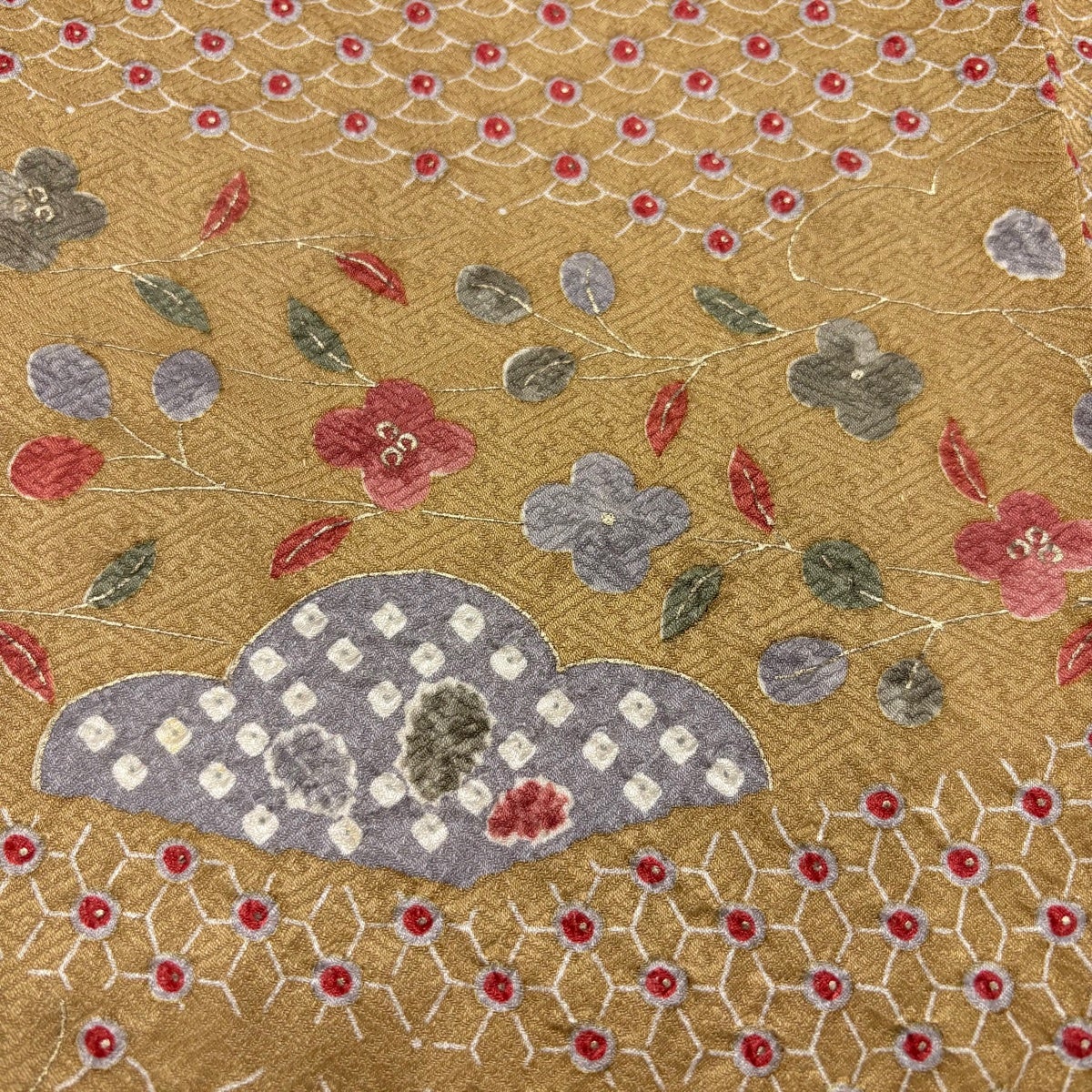 小紋 身丈165.5cm 裄丈67cm M 袷 草花 幾何学模様 金彩 薄茶色 正絹 優品