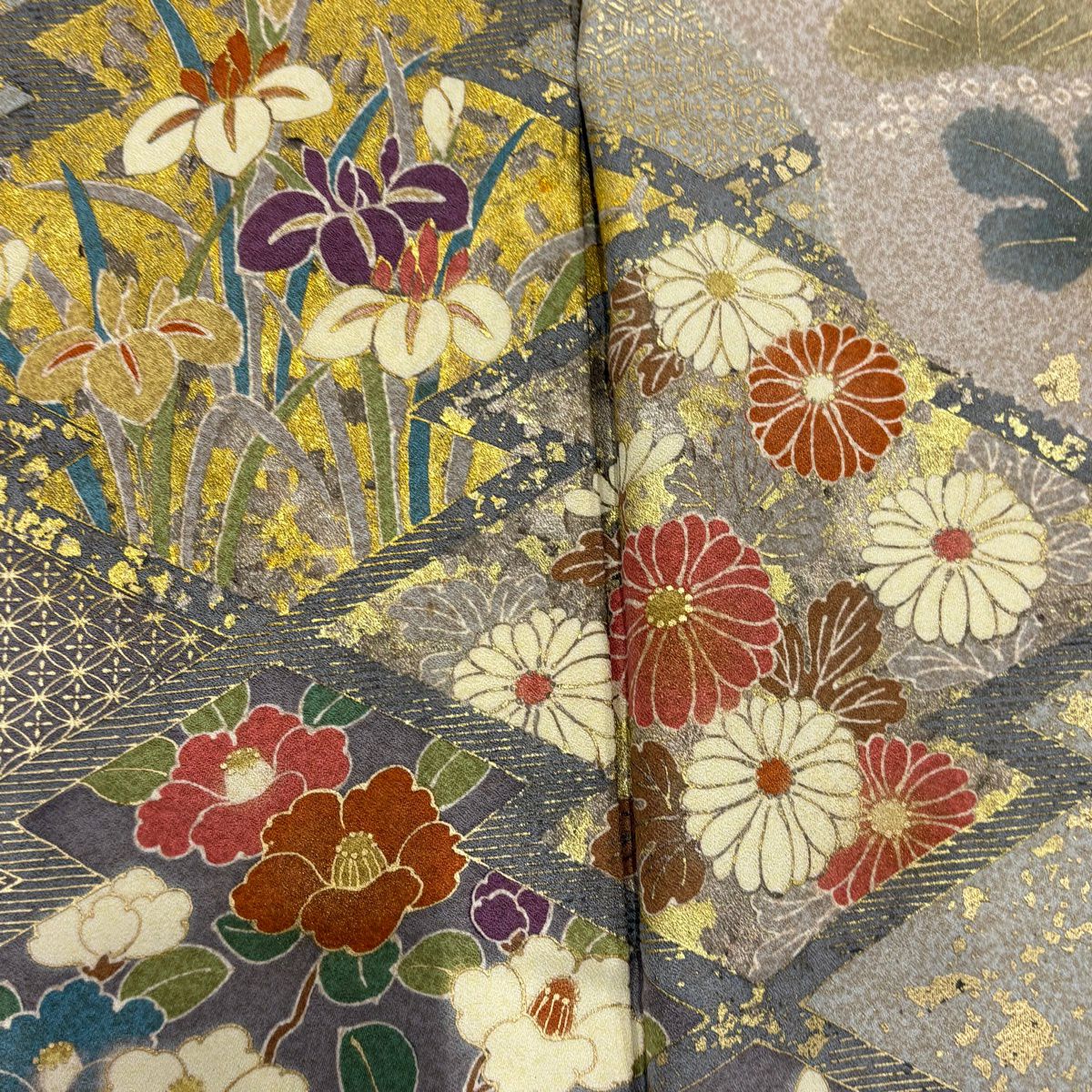 訪問着 身丈164.5cm 裄丈66.5cm M 袷 太鼓 菊 金彩 ぼかし 焦茶色 正絹 名品 三つ紋