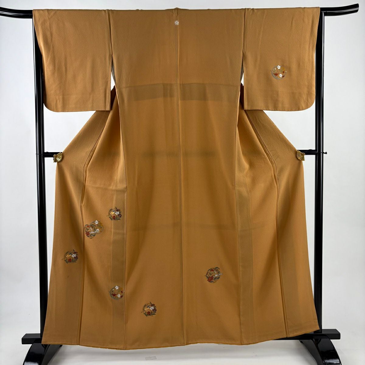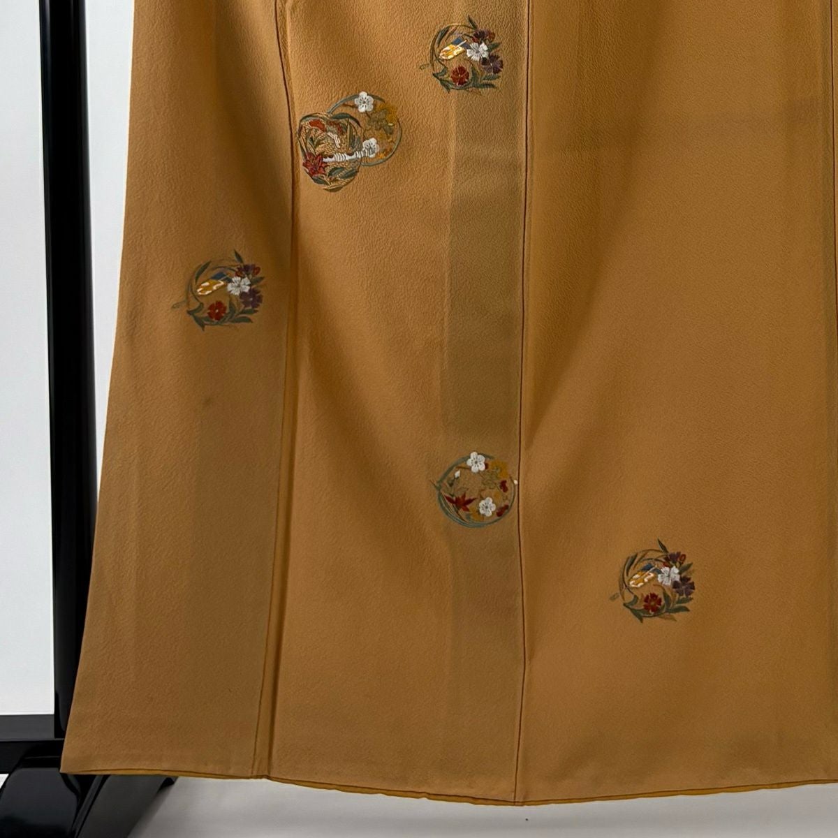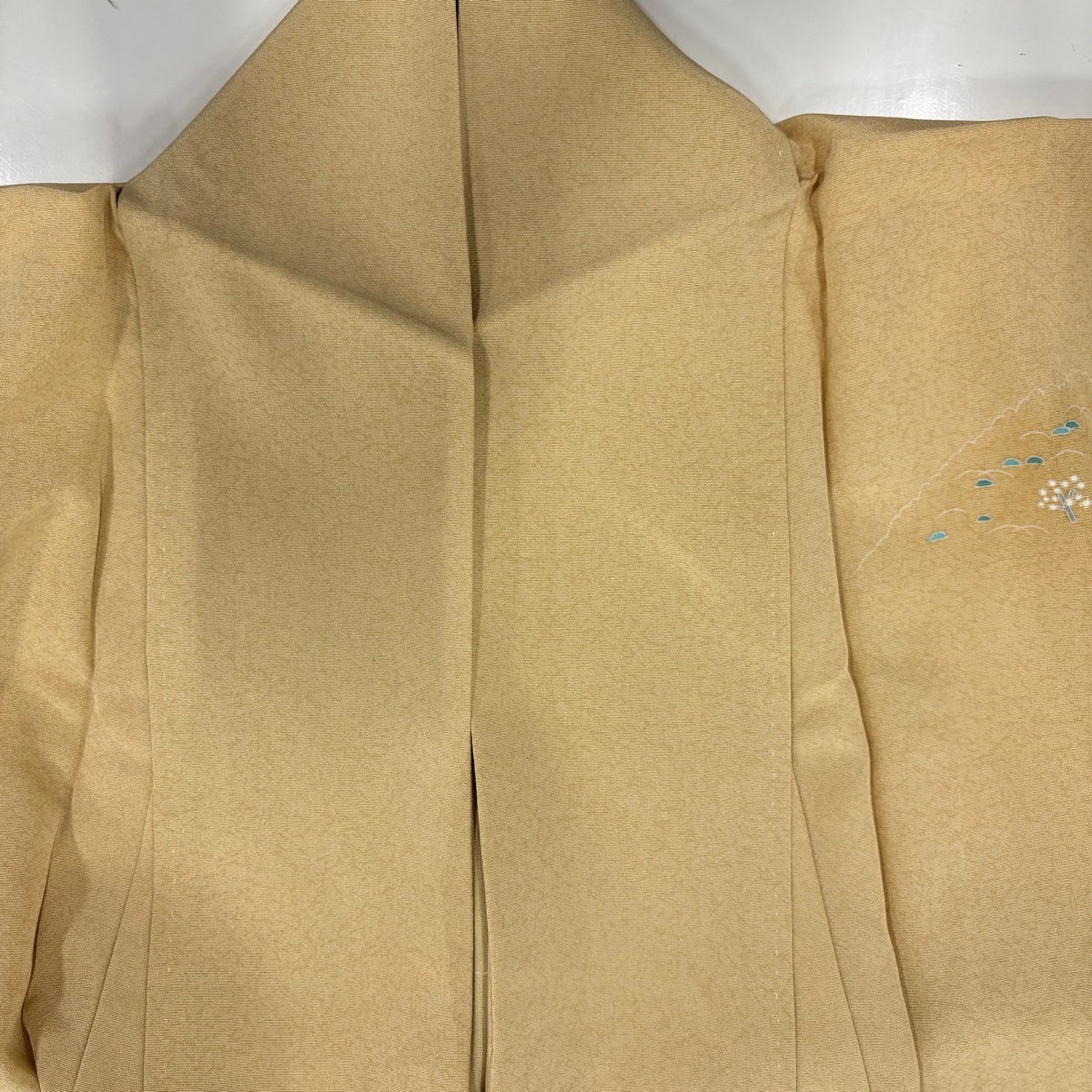 色無地 身丈152cm 裄丈62cm S 袷 毎田仁郎 落款あり 地紋 山吹茶色 正絹 秀品 一つ紋