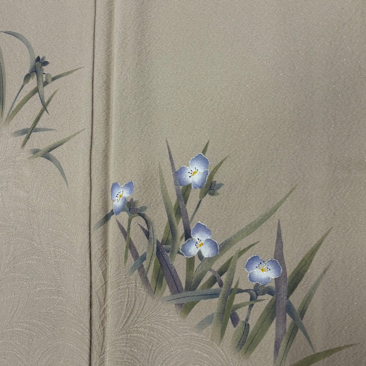 訪問着 身丈158.5cm 裄丈65cm M 袷 田村哲彦 落款あり 女人 秋草 ぼかし 薄茶色 正絹 名品 一つ紋