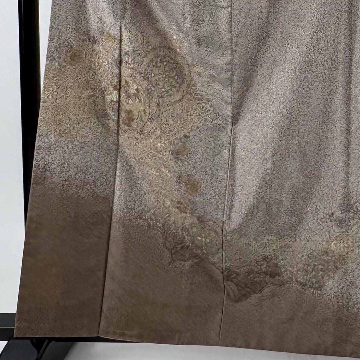 色留袖 身丈163.5cm 裄丈66cm M 袷 落款あり 家屋 松竹梅 刺繍 ぼかし 薄茶色 正絹 逸品 一つ紋