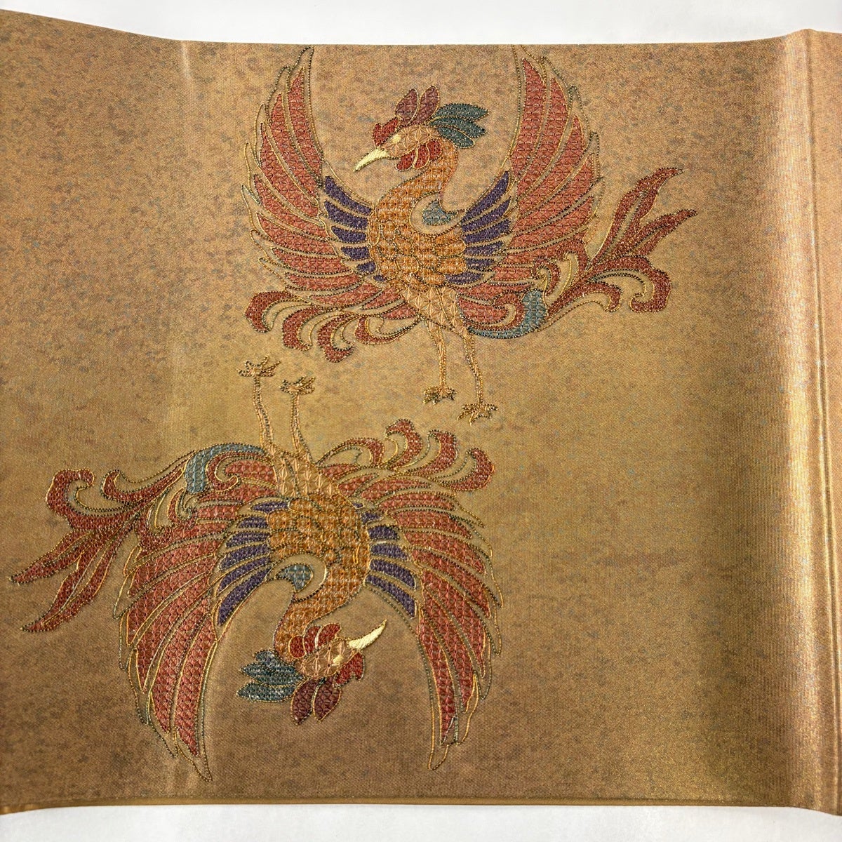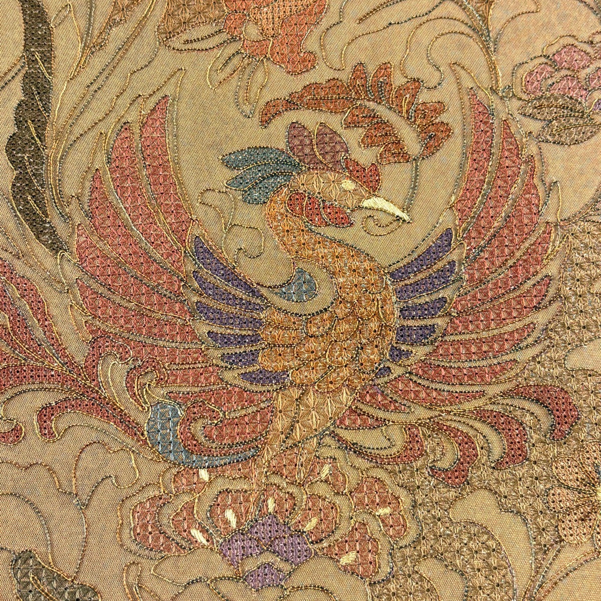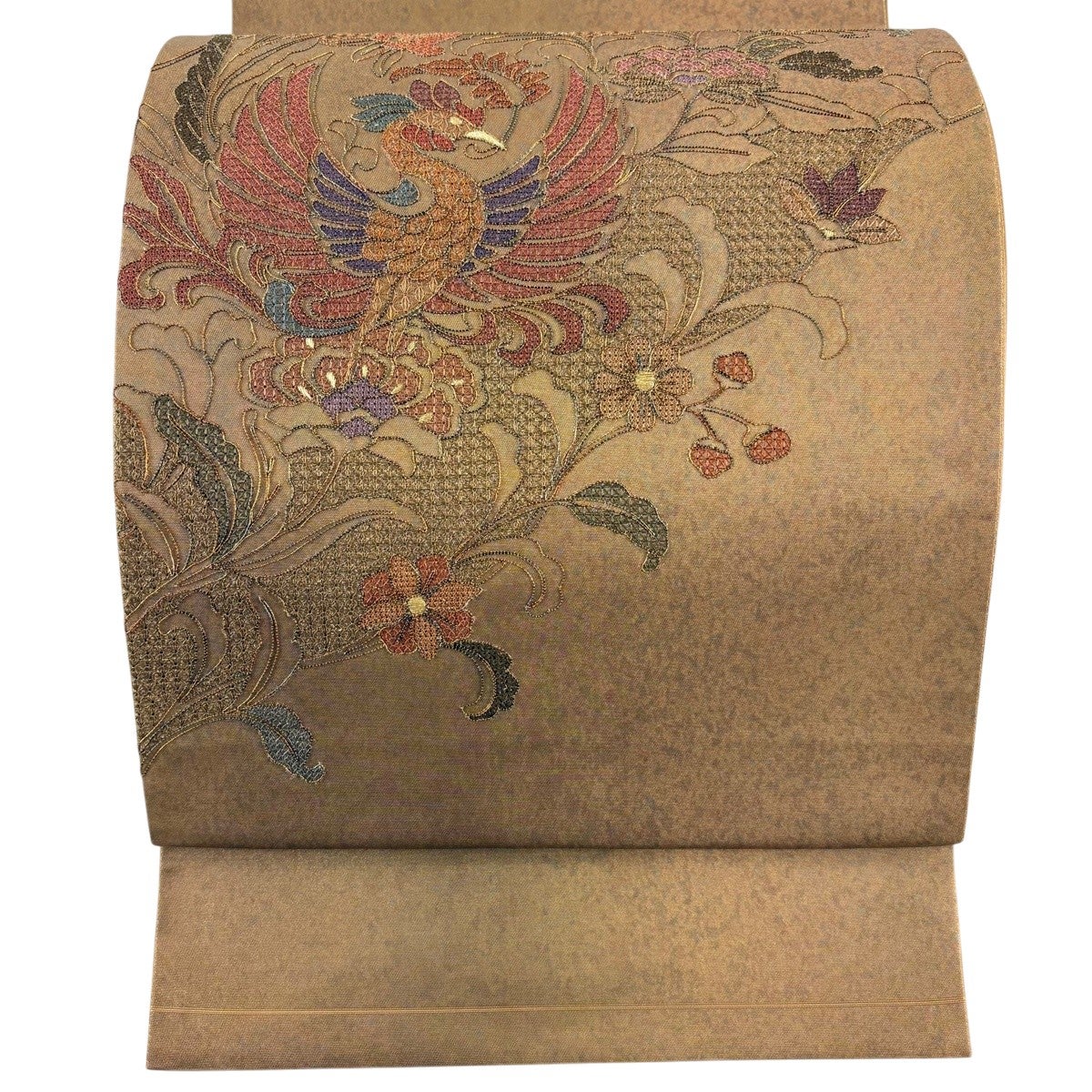 【美品】 袋帯 秀品 関西仕立て 鳳凰 草花 金糸 刺繍 茶色 お太鼓柄 正絹