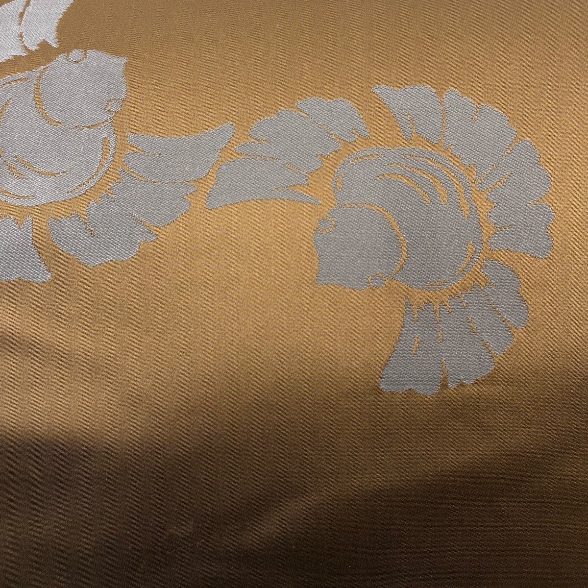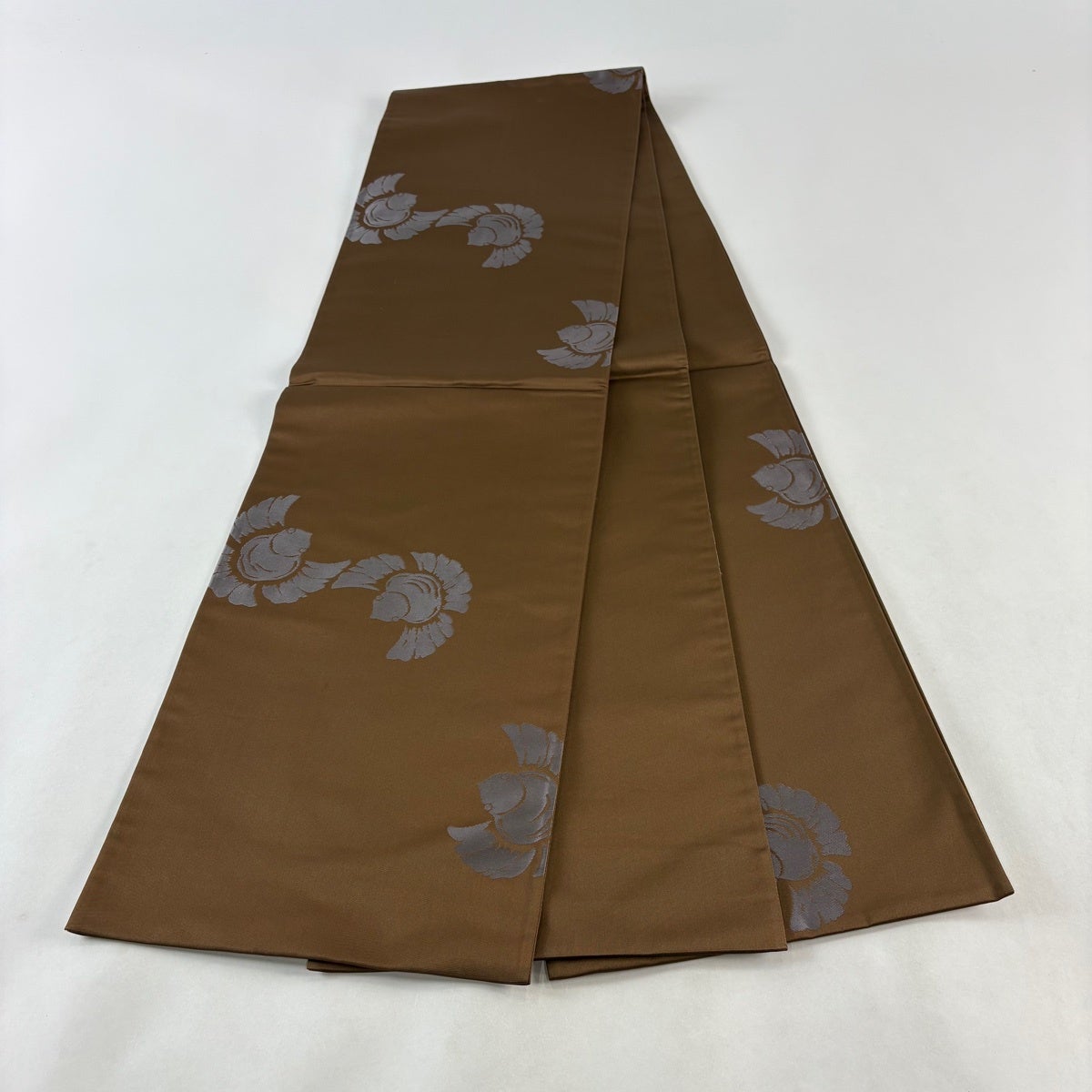 袋帯 名品 堀省平 落款あり 花 幾何学模様 金通し 金彩 茶色 お太鼓柄 正絹