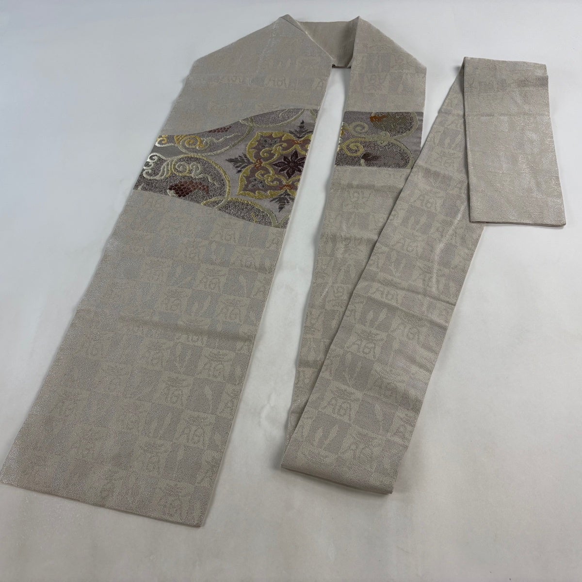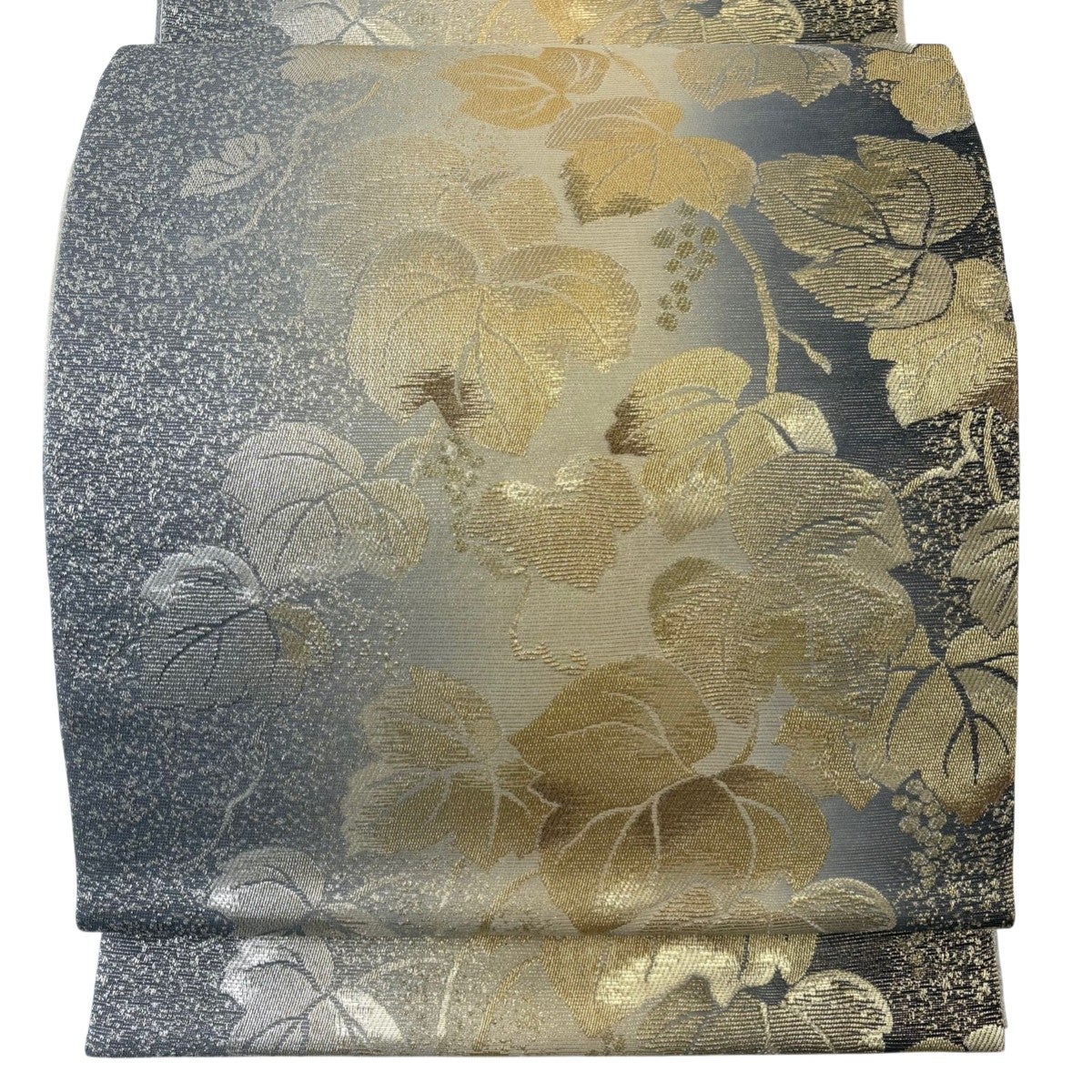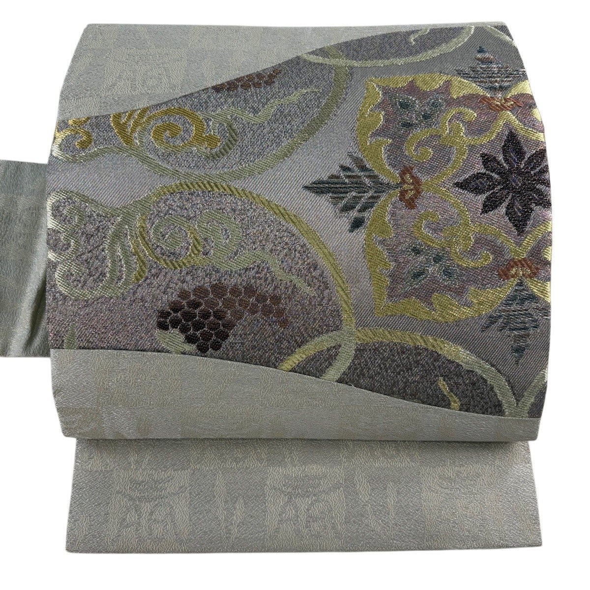 【美品】 名古屋帯 逸品 華文 葡萄 箔 銀糸 灰色 正絹