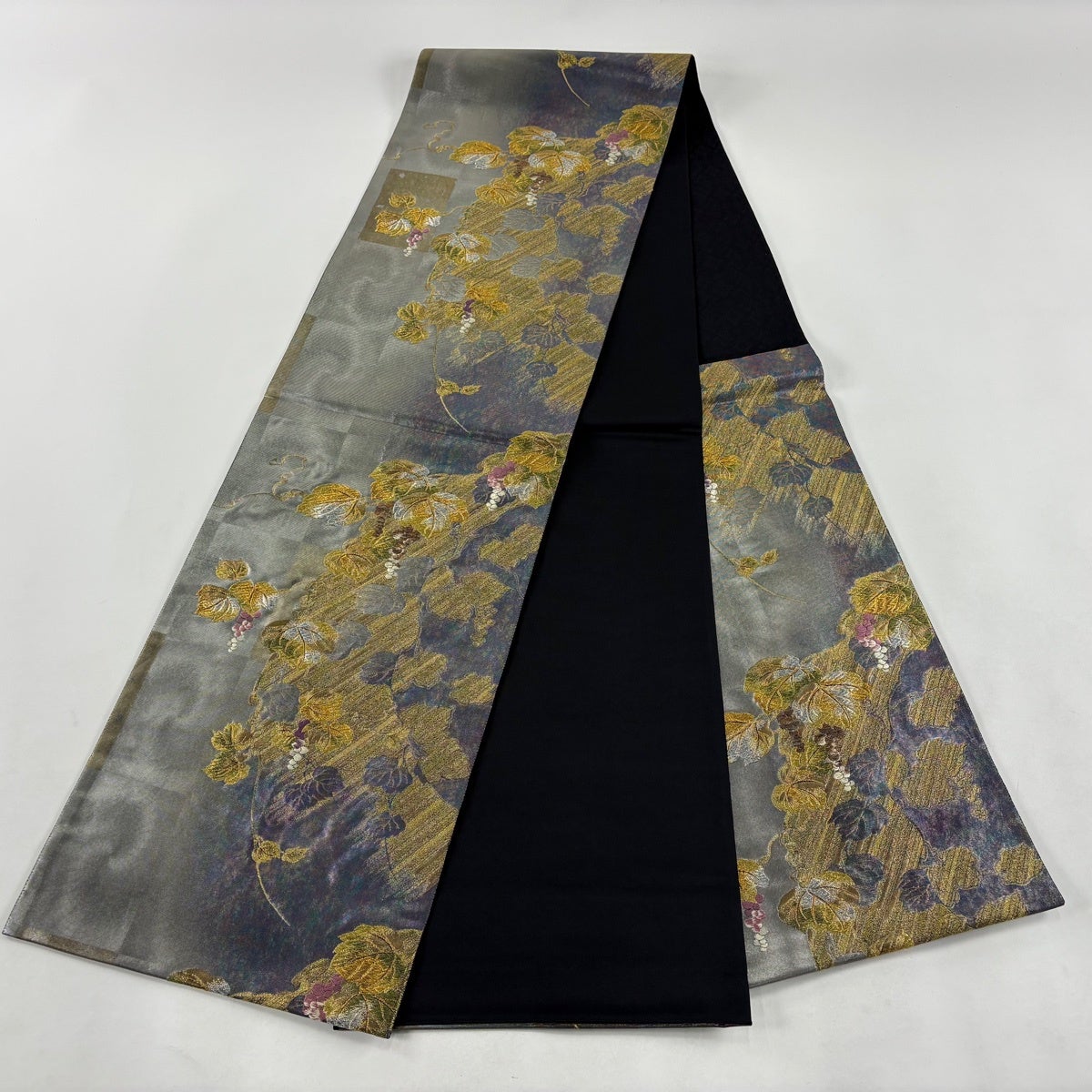 【美品】 袋帯 名品 花唐草 葡萄 箔 灰色 六通 正絹