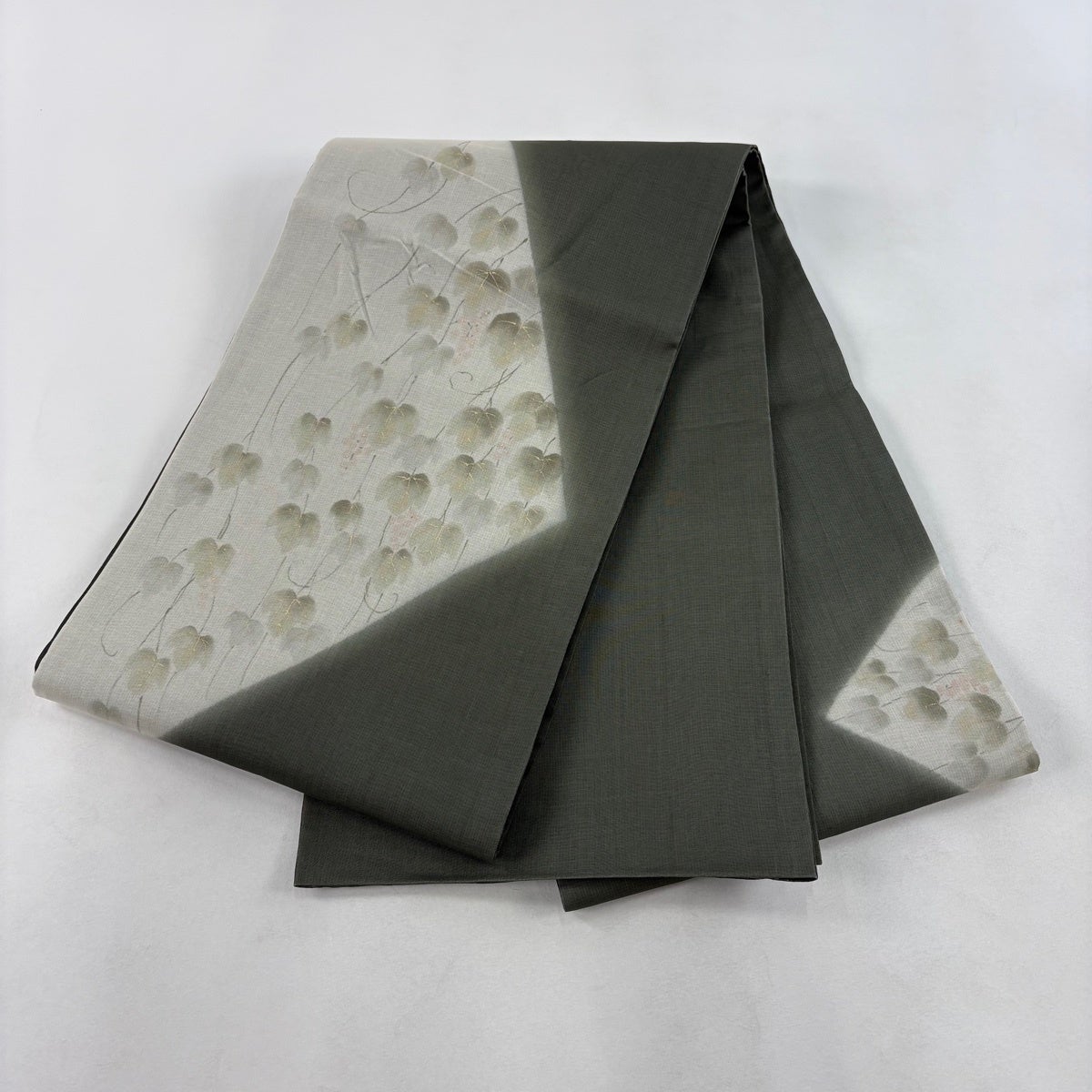 【美品】 開き名古屋帯 秀品 落款あり 紬地 葡萄 灰緑 正絹