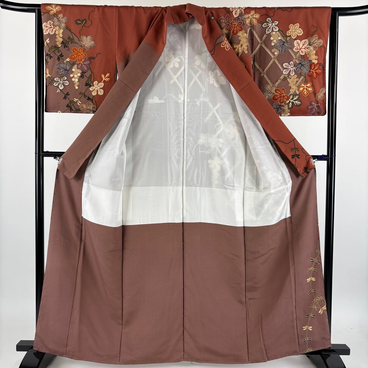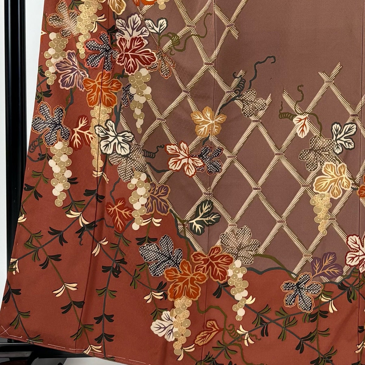 【美品】 付下げ 身丈157.5cm 裄丈64.5cm M 袷 葡萄 地紋 金銀彩 ぼかし 茶色 正絹 秀品