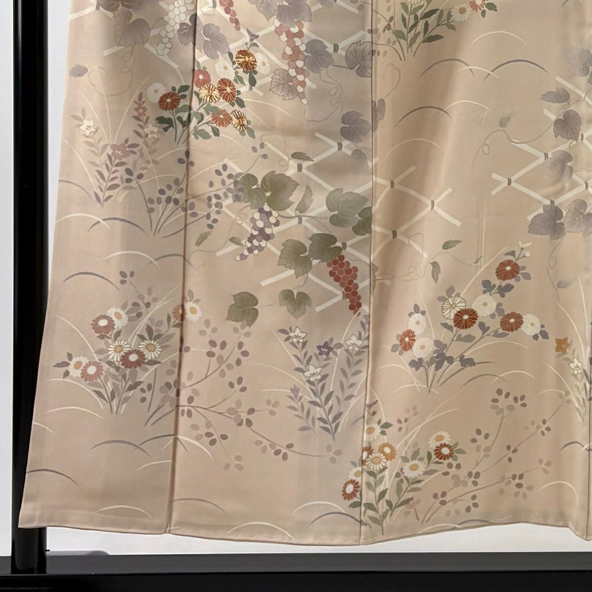 付下げ 身丈155.5cm 裄丈67cm M 袷 牡丹 葡萄 箔 金彩 ベージュ 正絹 秀品 一つ紋