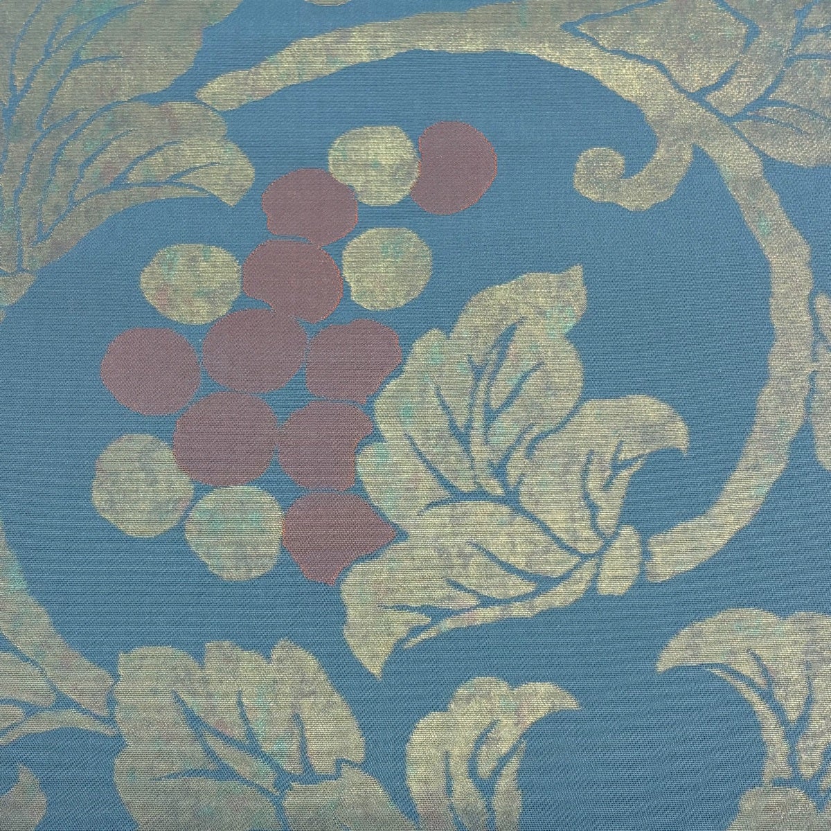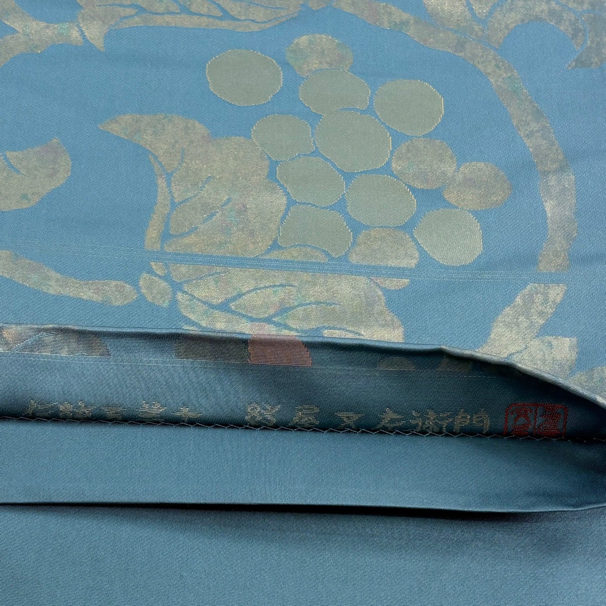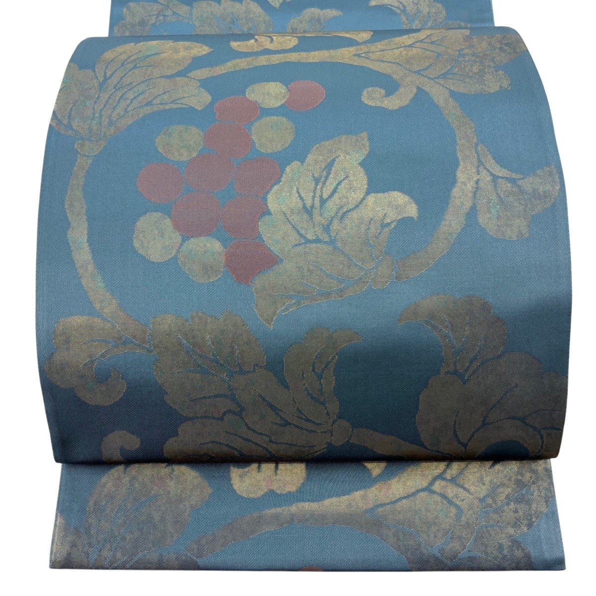 【美品】 袋帯 秀品 落款あり 伝統工芸士 紋屋又左衛門 葡萄唐草 箔 青灰色 六通 正絹