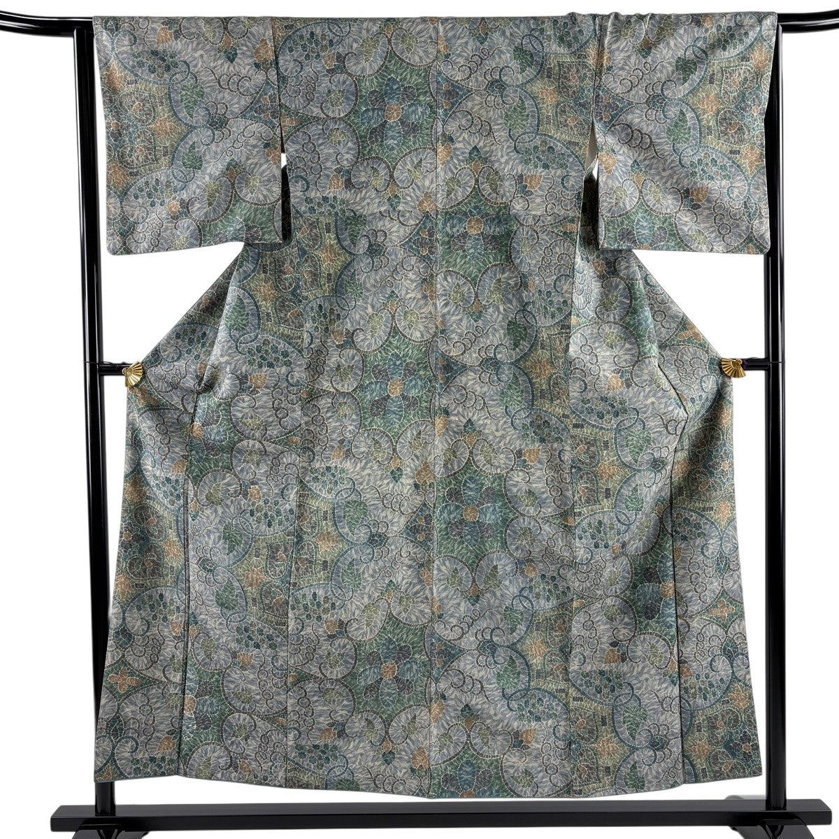 付下げ 身丈160.5cm 裄丈65cm M 単衣 笠松 葡萄唐草 箔 金彩 灰緑 正絹 秀品