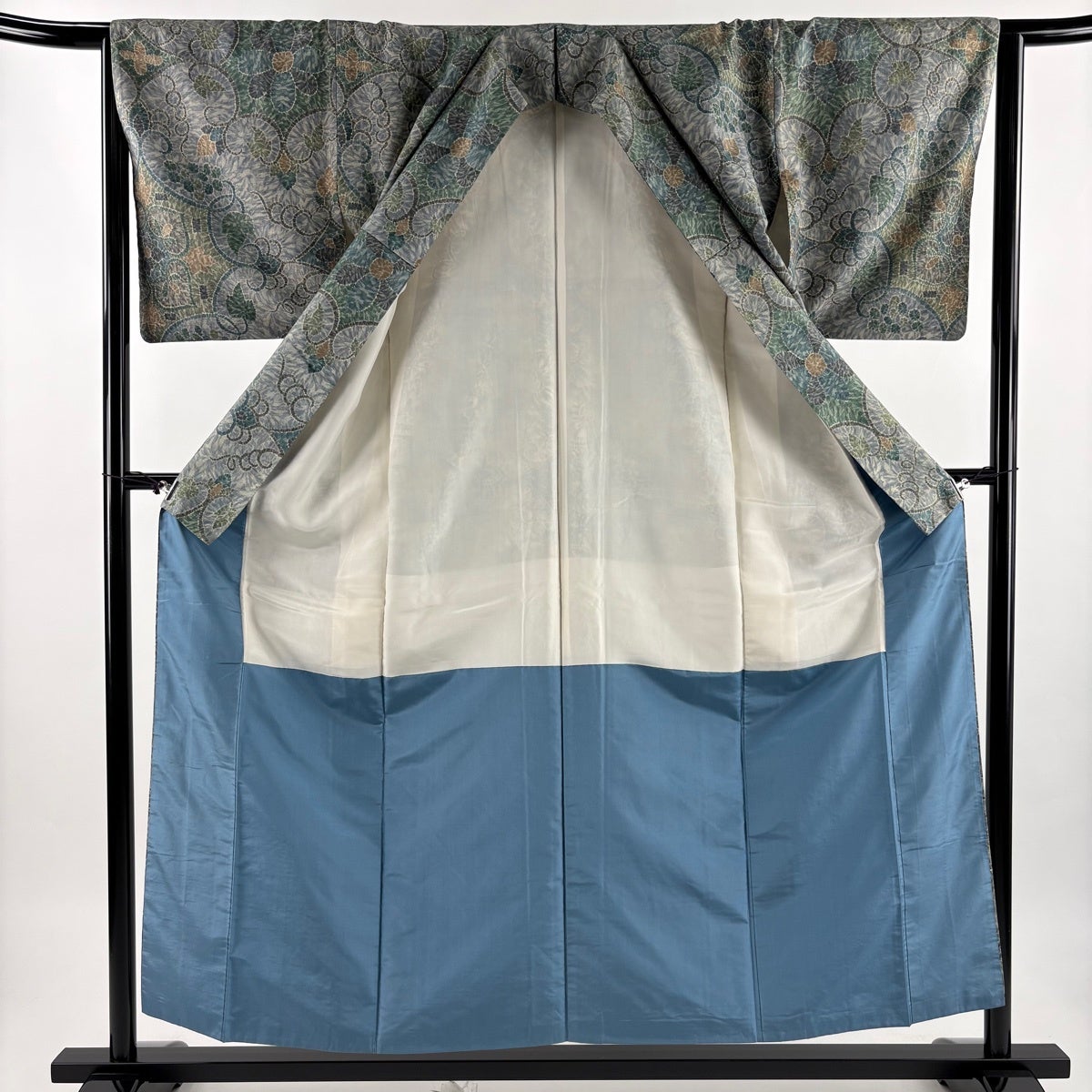 訪問着 身丈153cm 裄丈62.5cm S 袷 人間国宝 福田喜重 落款あり 葡萄唐草 金銀彩 刺繍 青灰色 正絹 逸品 一つ紋