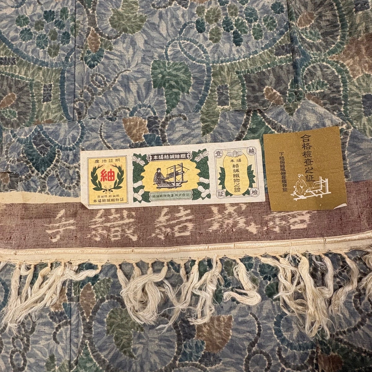 紬 身丈155cm 裄丈61cm S 袷 証紙あり 縦縞 葡萄唐草 青緑 正絹 秀品