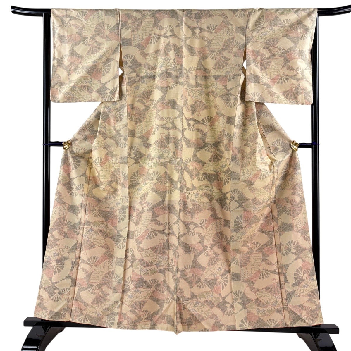 訪問着 身丈160cm 裄丈65cm M 袷 草花 扇面 金糸 金彩 薄オレンジ 正絹 秀品