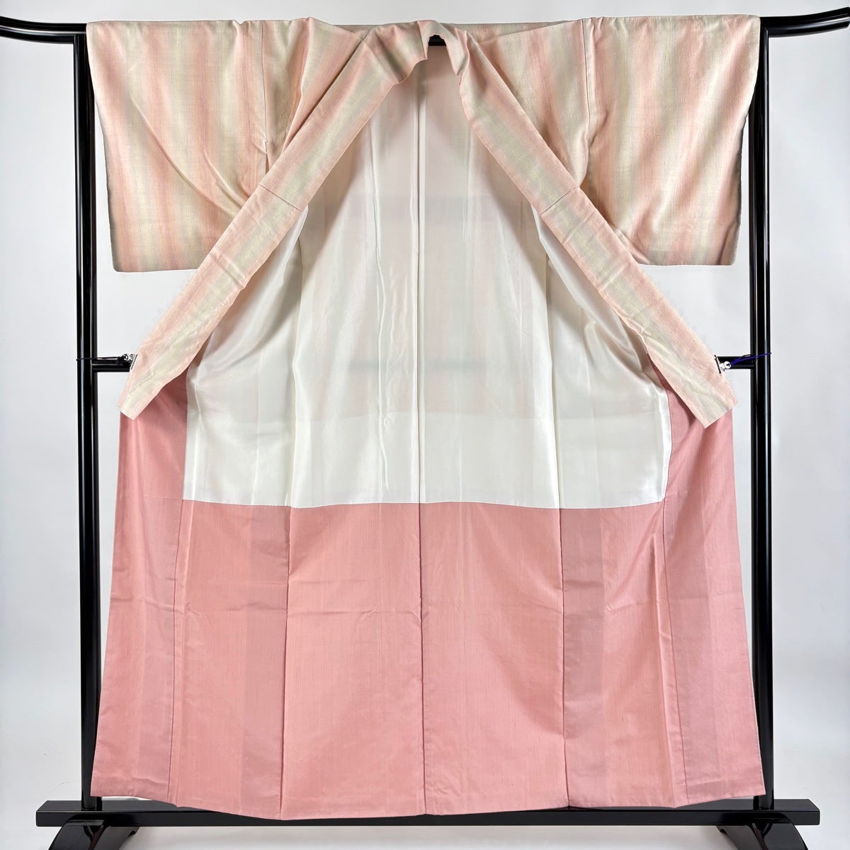30%OFF 紬 身丈159cm 裄丈64cm M 袷 落款あり 縦縞 薄ピンク 正絹 名品 K30