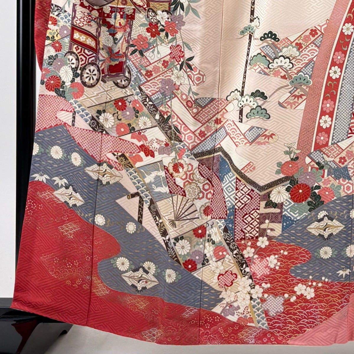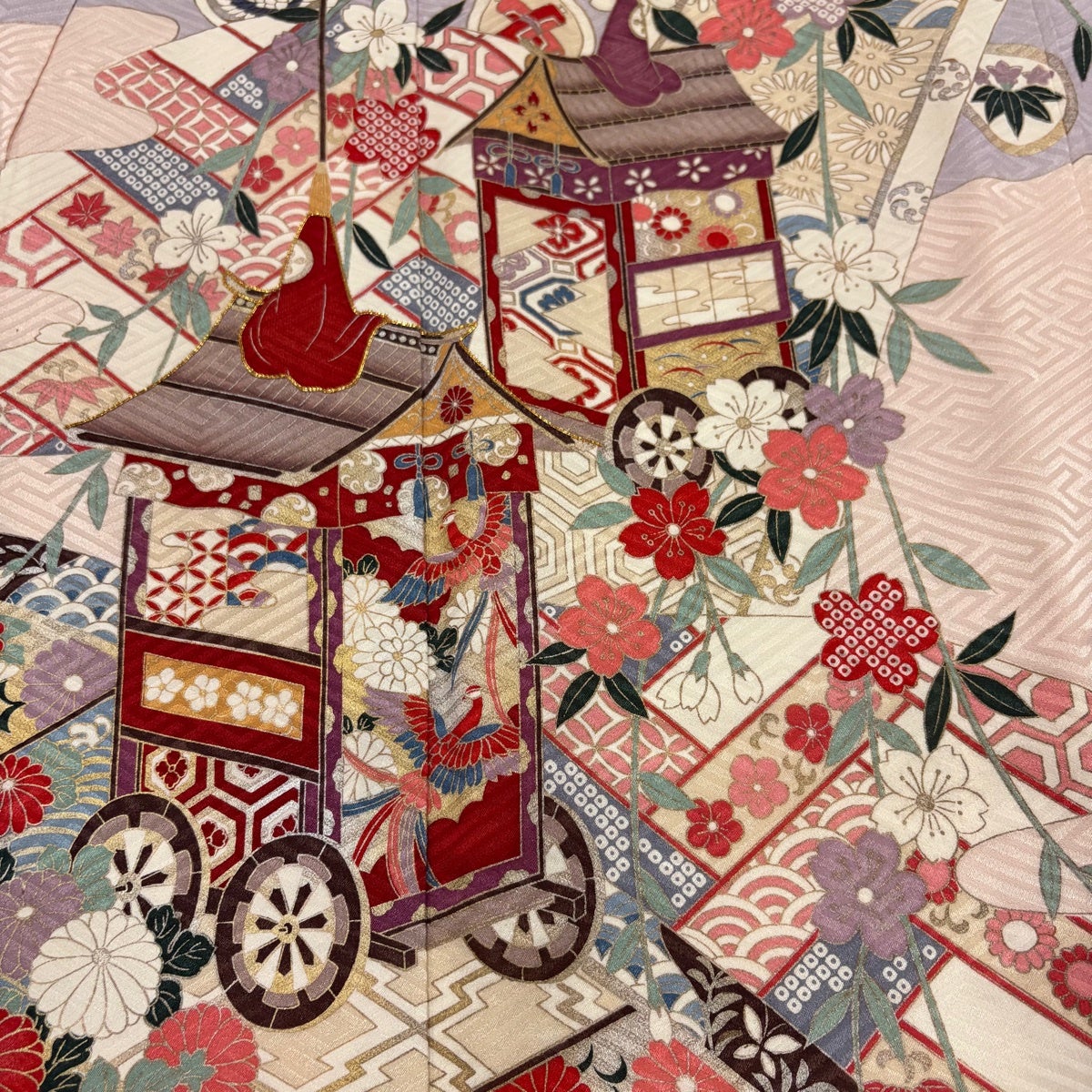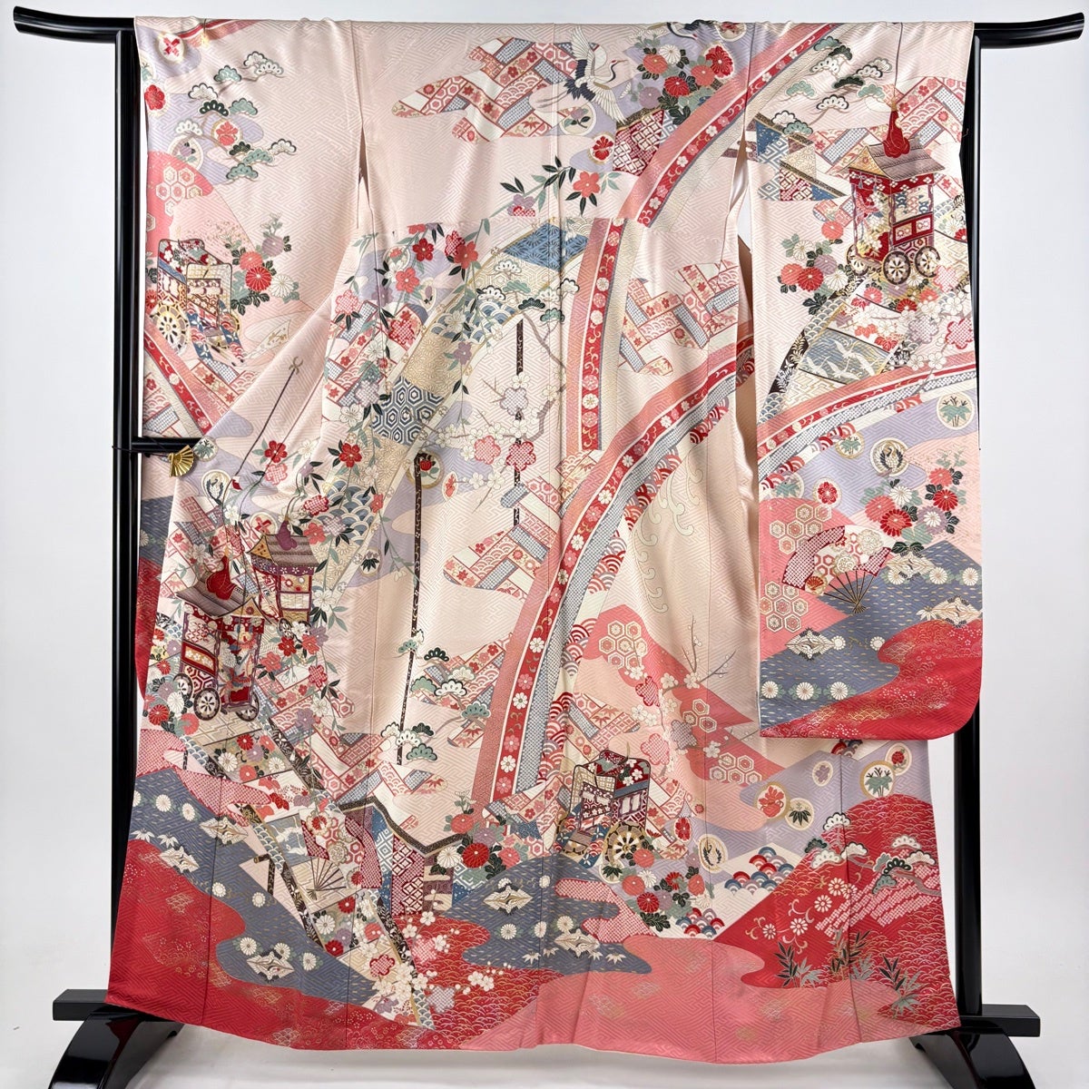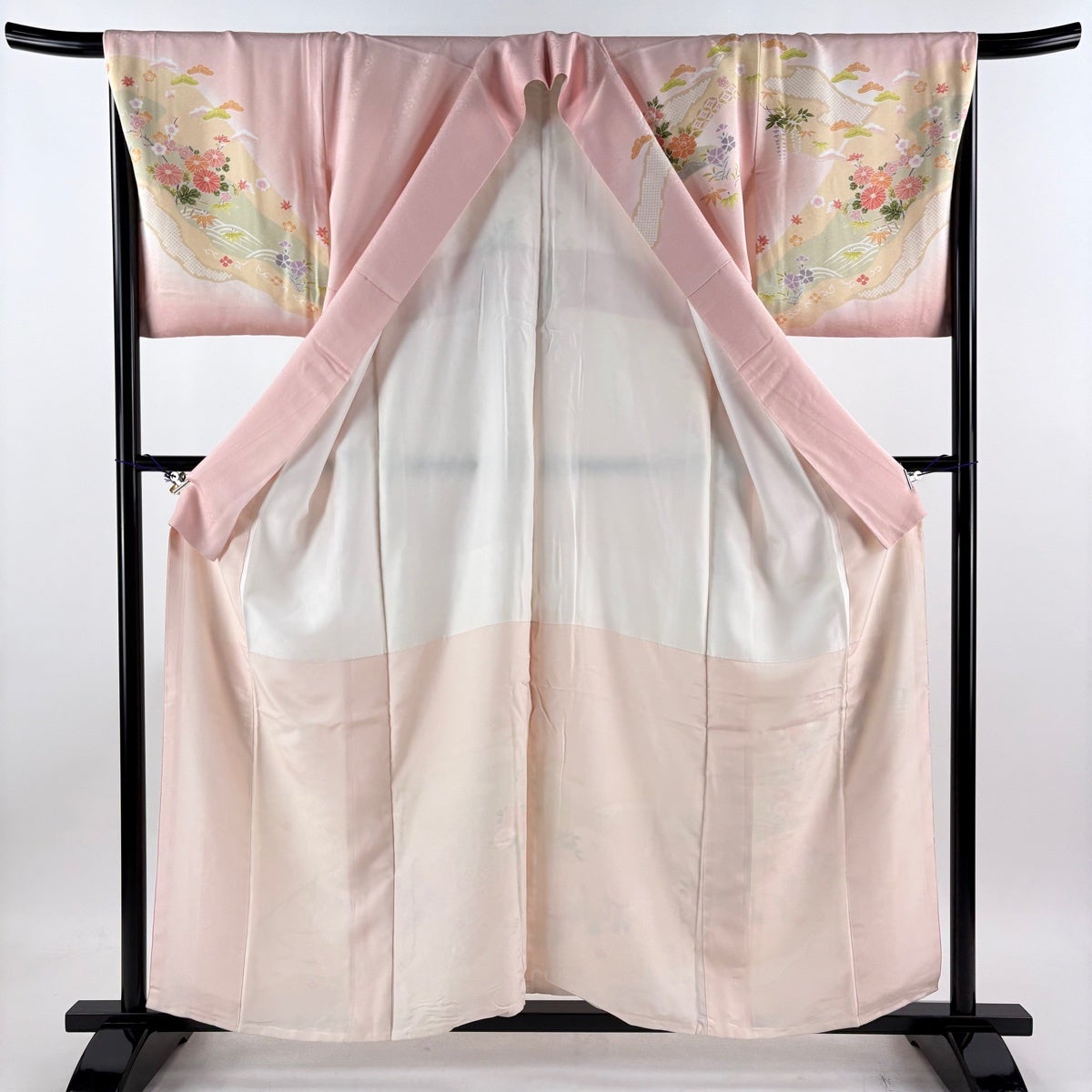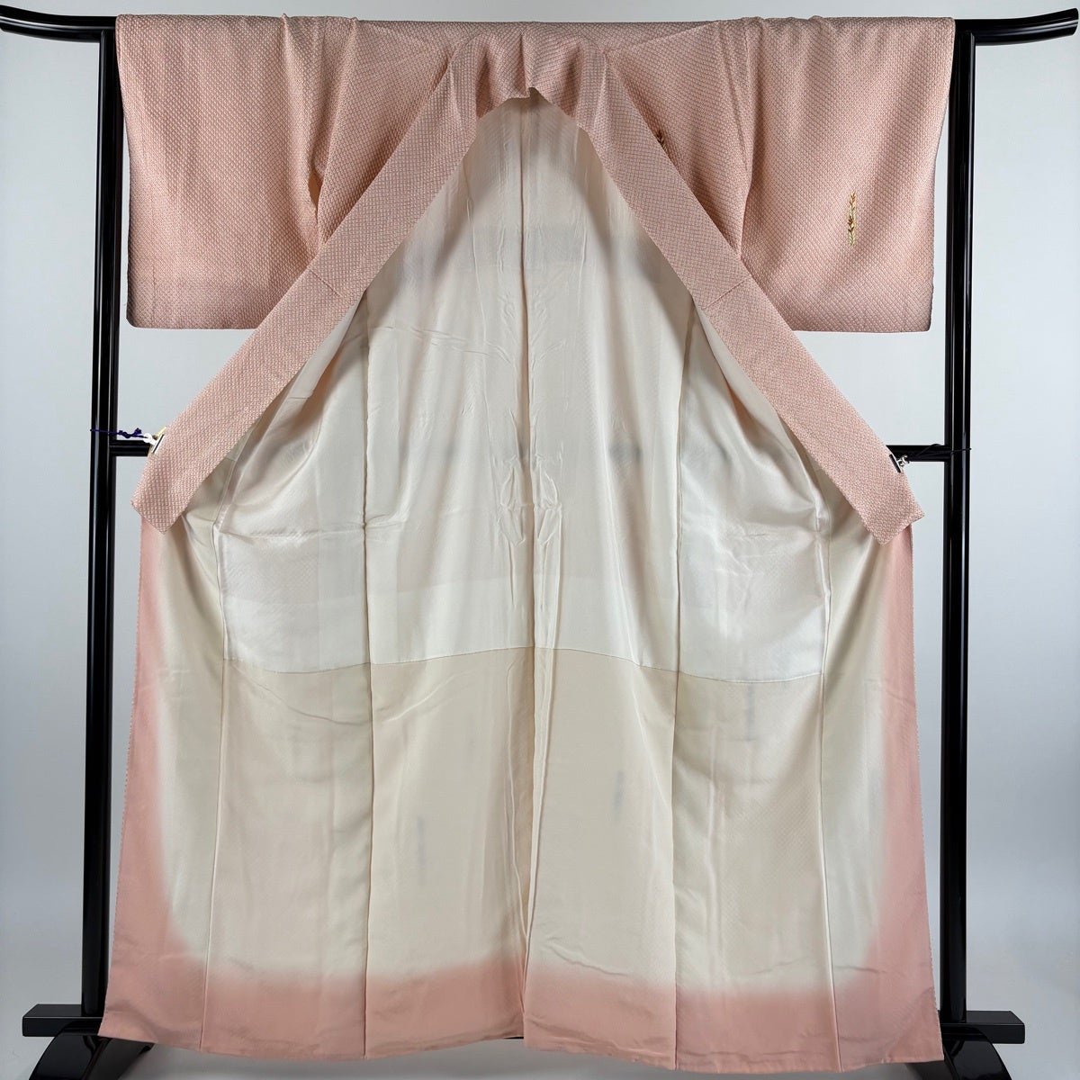色留袖 身丈167cm 裄丈67cm M 袷 御所車 几帳 金糸 ぼかし 薄ピンク 正絹 秀品 一つ紋