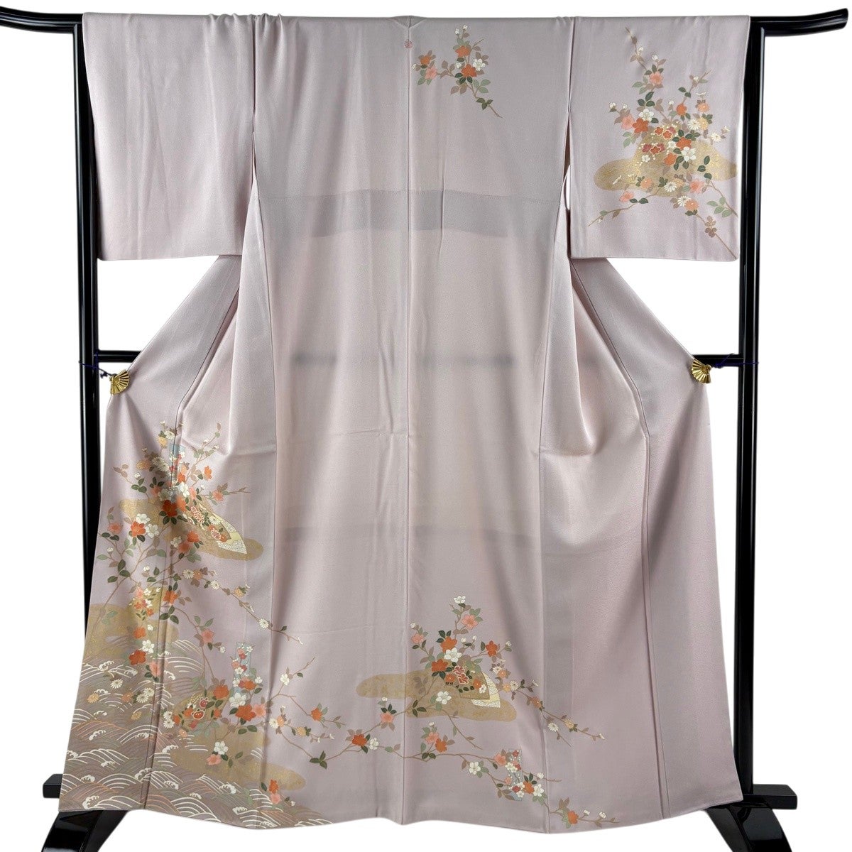 訪問着 身丈161cm 裄丈67.5cm L 袷 糸巻き 橘花 金糸 金彩 薄ピンク 正絹 秀品 一つ紋