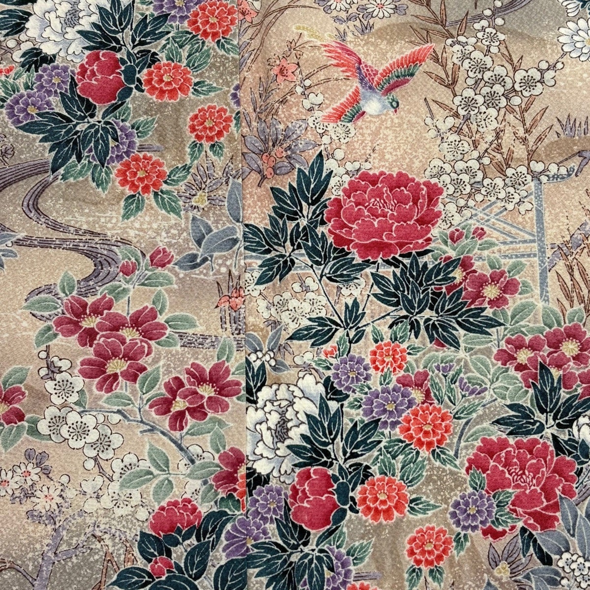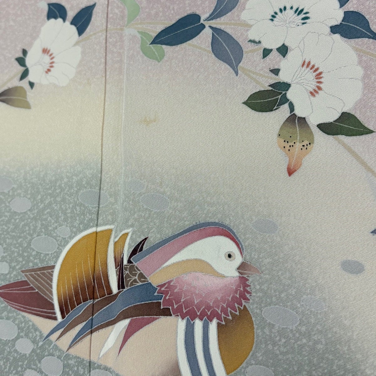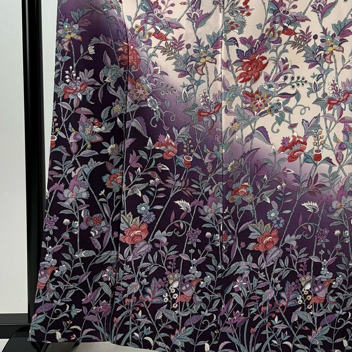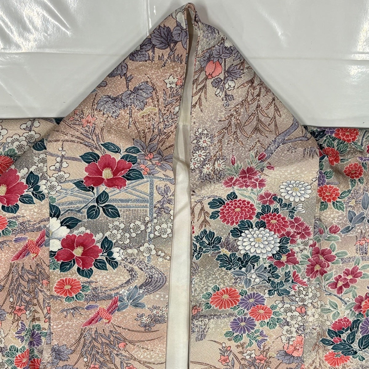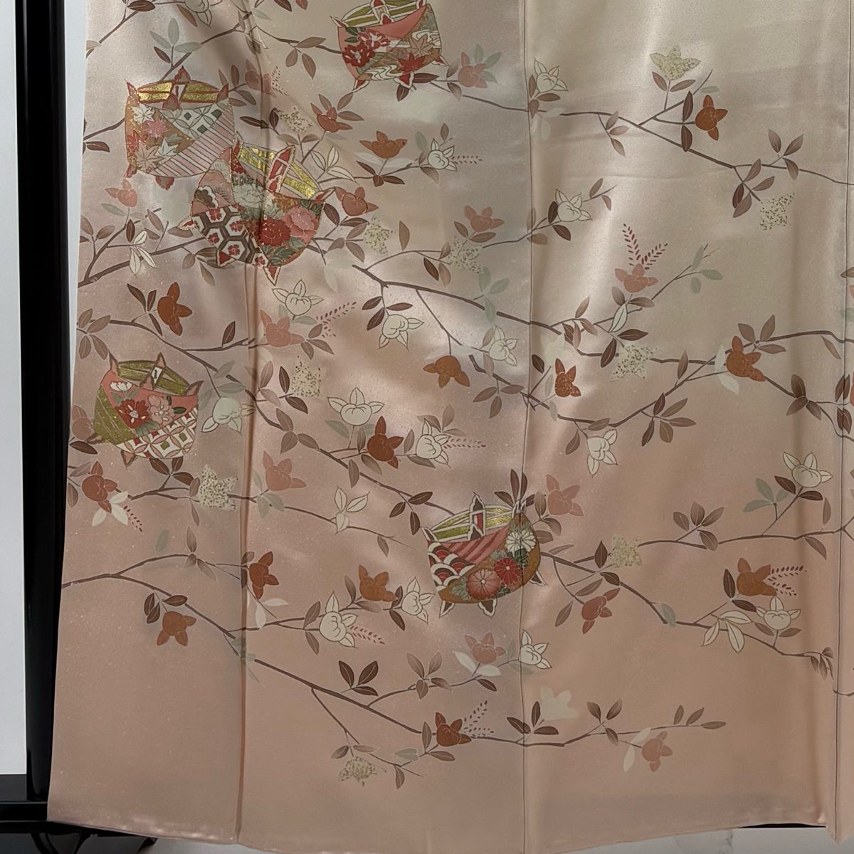 【美品】 小紋 身丈161cm 裄丈67cm M 袷 草花 鳥 ぼかし 縮緬 薄ピンク 正絹 優品