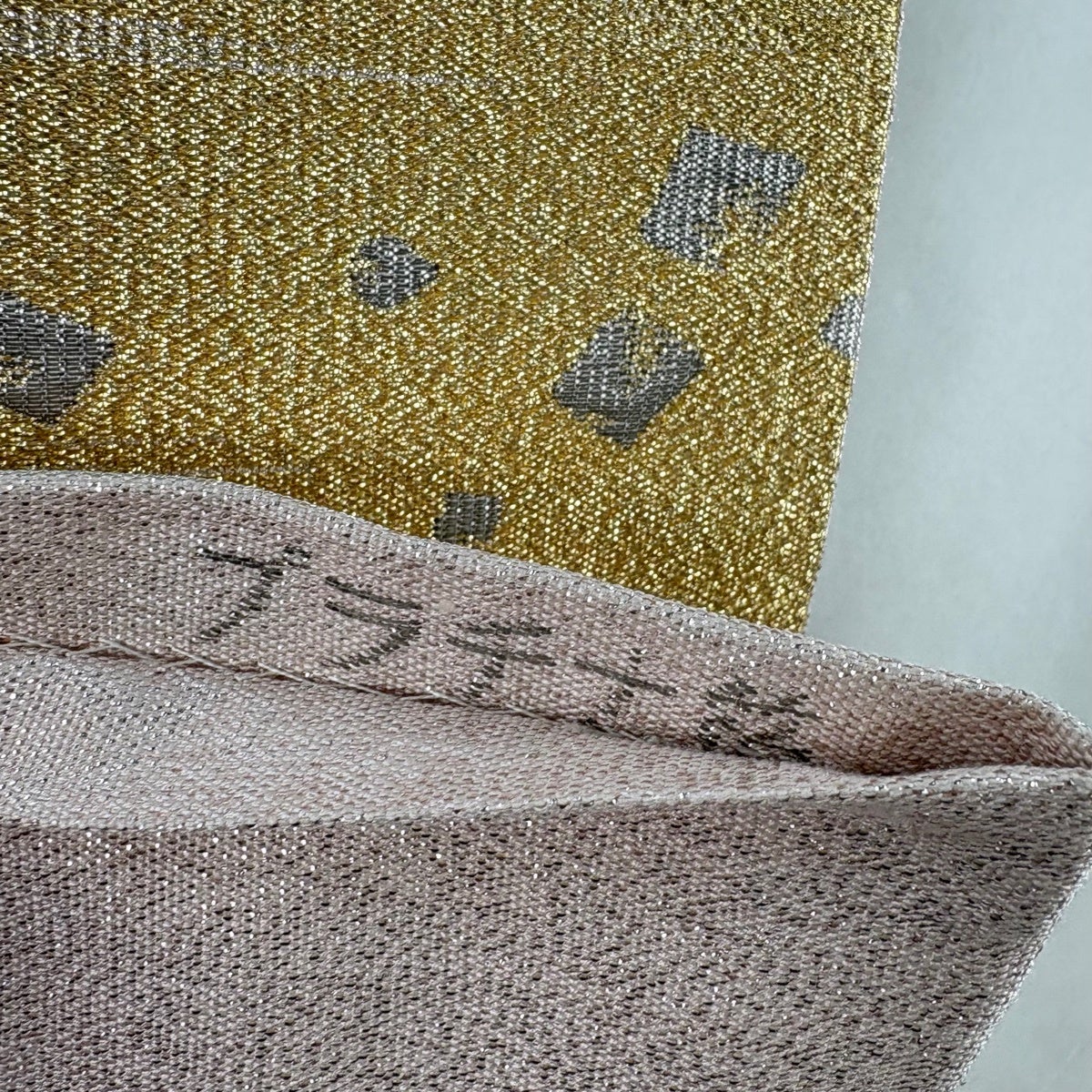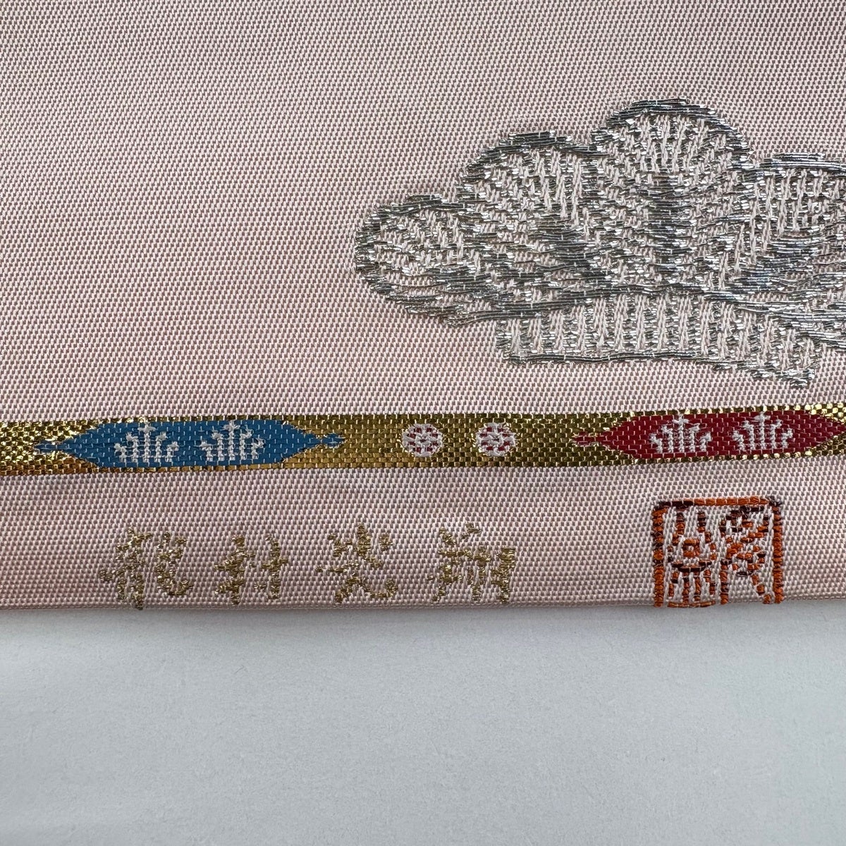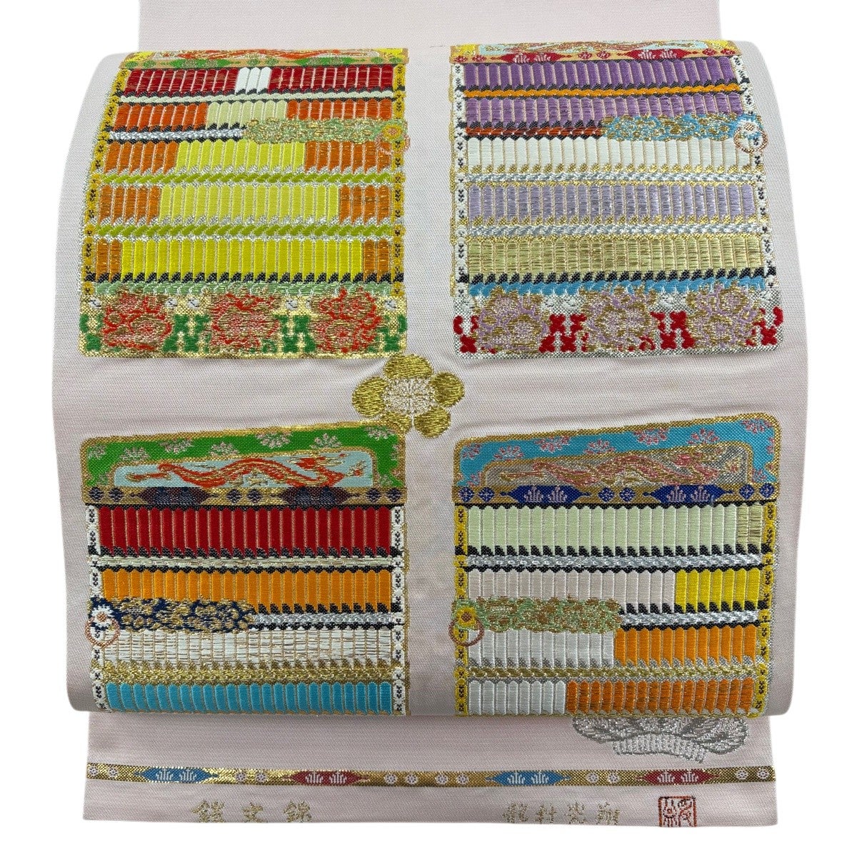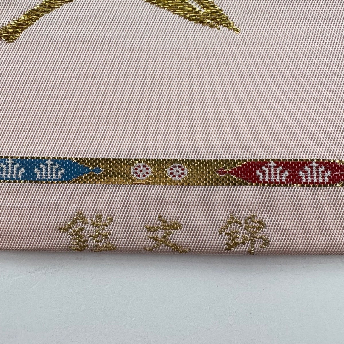 【美品】 袋帯 逸品 落款あり 龍村光翔 関西仕立て 鎧文錦 金銀糸 箔 薄ピンク お太鼓柄 正絹