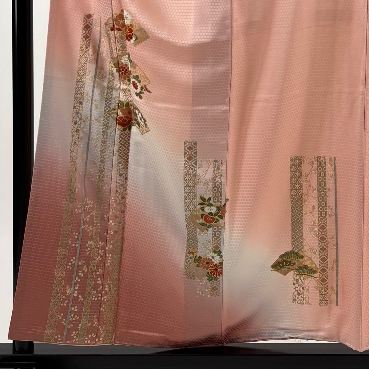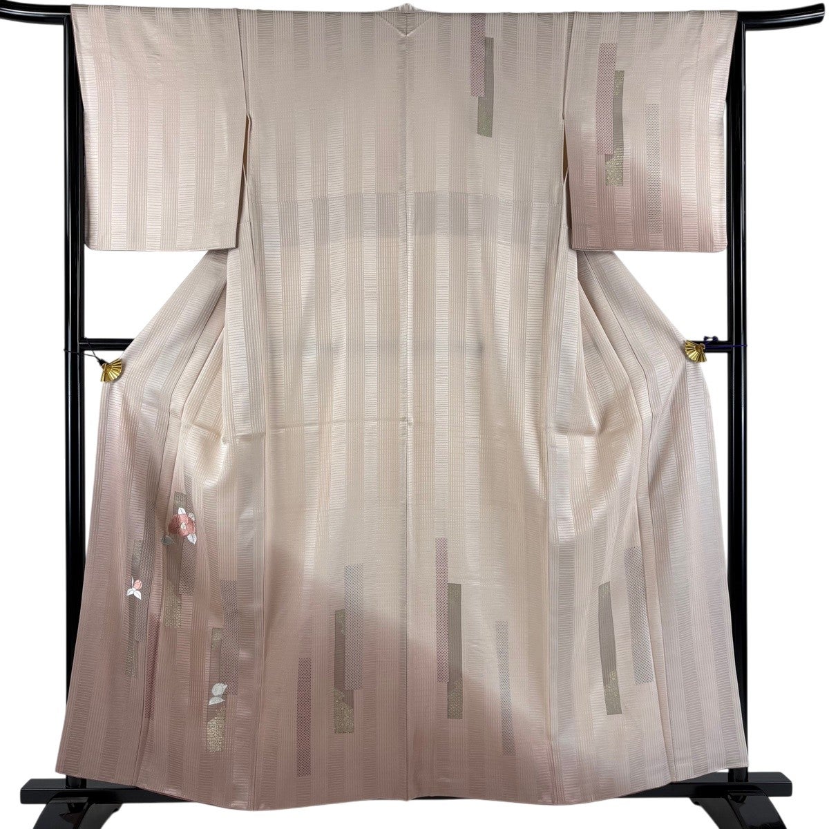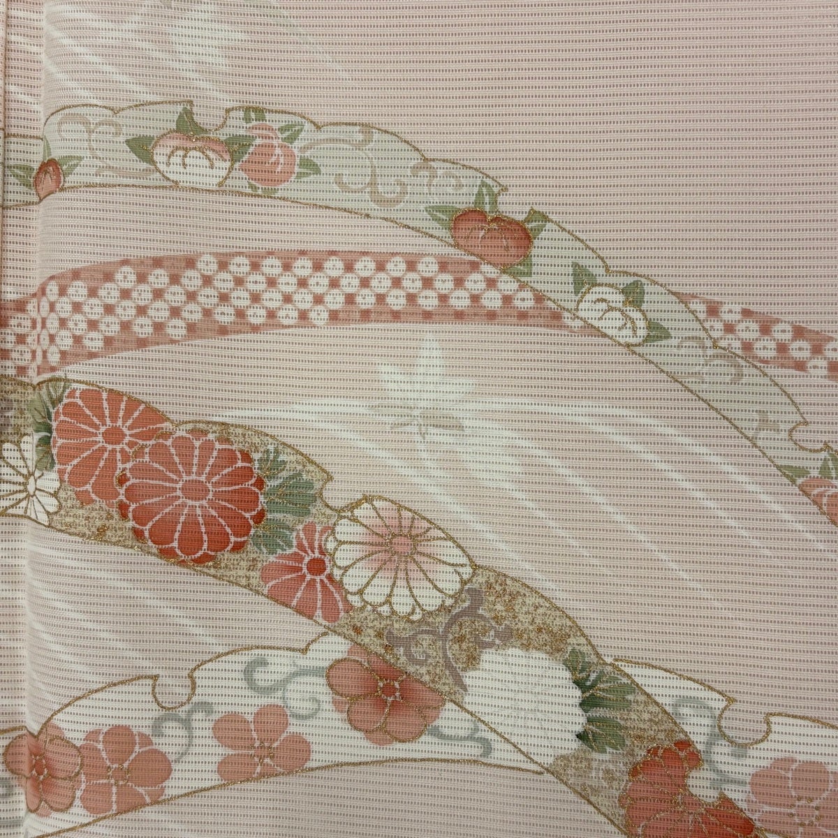 訪問着 身丈157cm 裄丈65.5cm M 袷 花唐草 横縞 金銀彩 箔 薄ピンク 正絹 秀品