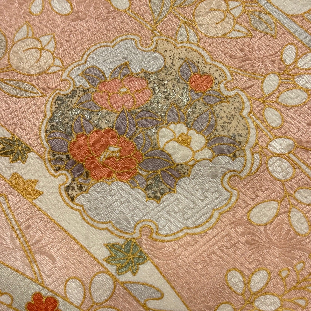 他の画像を見る 50%OFF 名古屋帯 逸品 落款あり 証紙あり 八寸名古屋帯 松葉仕立て 西陣 小川英 共箱付き 扇面 葉柄 金銀糸 薄ピンク 正絹 K50 当店通常価格 ¥ 44,800 ¥ 22,400 税込