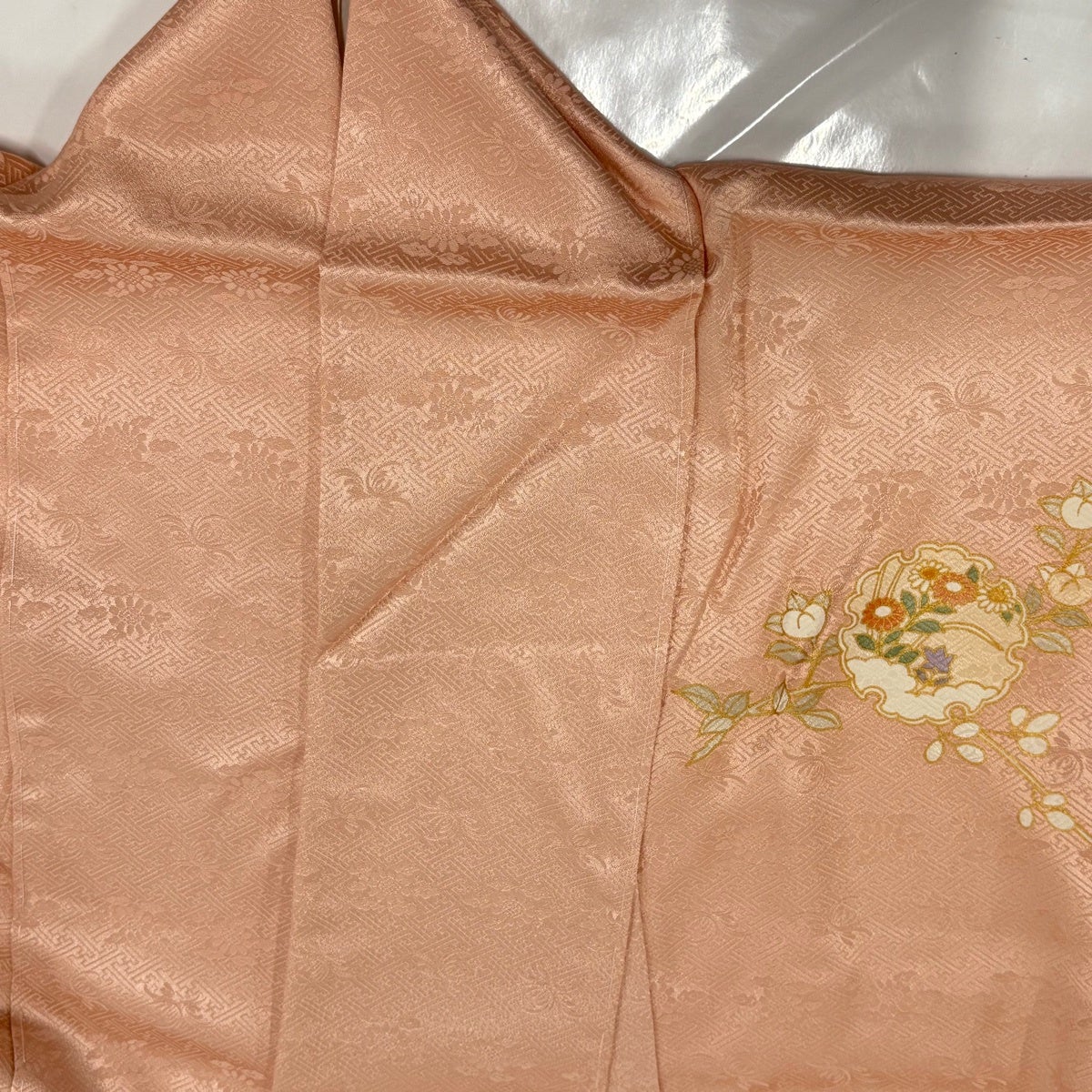 他の画像を見る 【最終価格】 70%OFF 色留袖 身丈163cm 裄丈67cm M 袷 千總 落款あり 桐 菊 刺繍 金糸 薄ピンク 正絹 逸品 一つ紋 K70 当店通常価格 ¥ 63,800 ¥ 19,140 税込