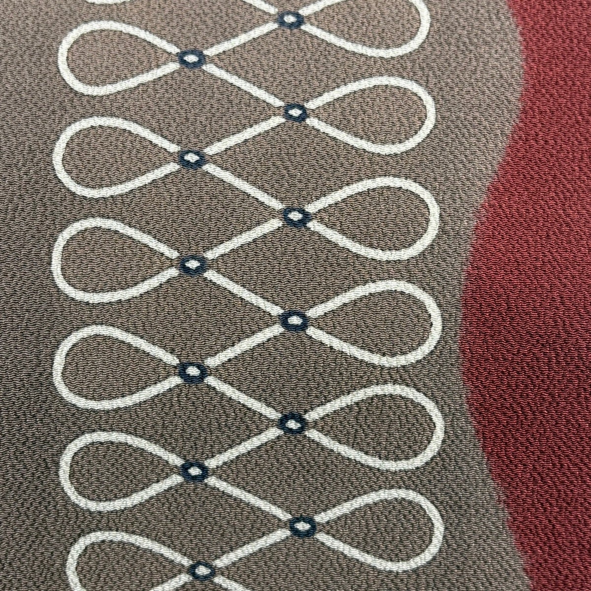 名古屋帯 逸品 栗山吉三郎 落款あり 幾何学模様 縮緬 薄小豆 正絹