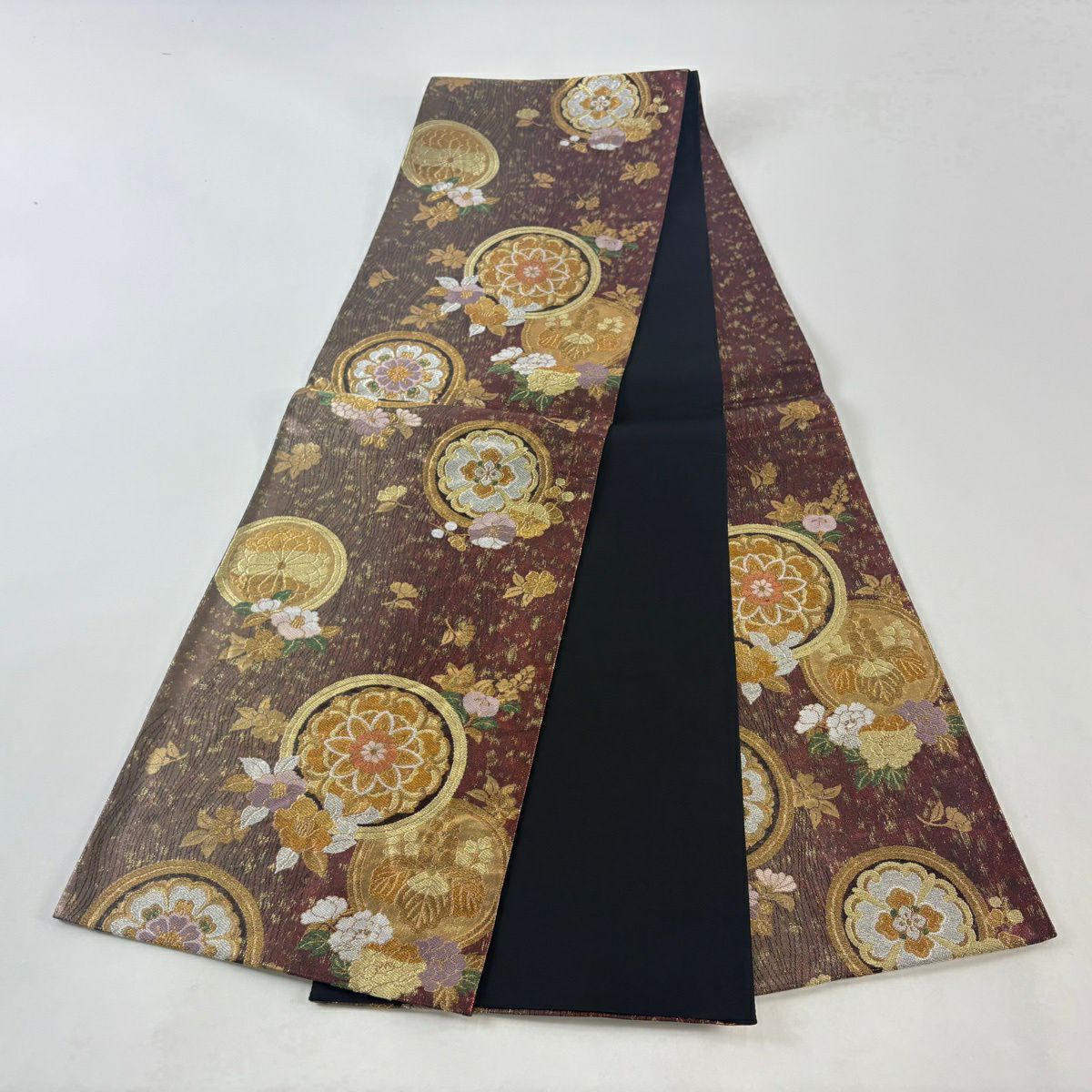 50%OFF 袋帯 逸品 草花 斜縞 相良刺繍 金糸 薄小豆 お太鼓柄 正絹 K50
