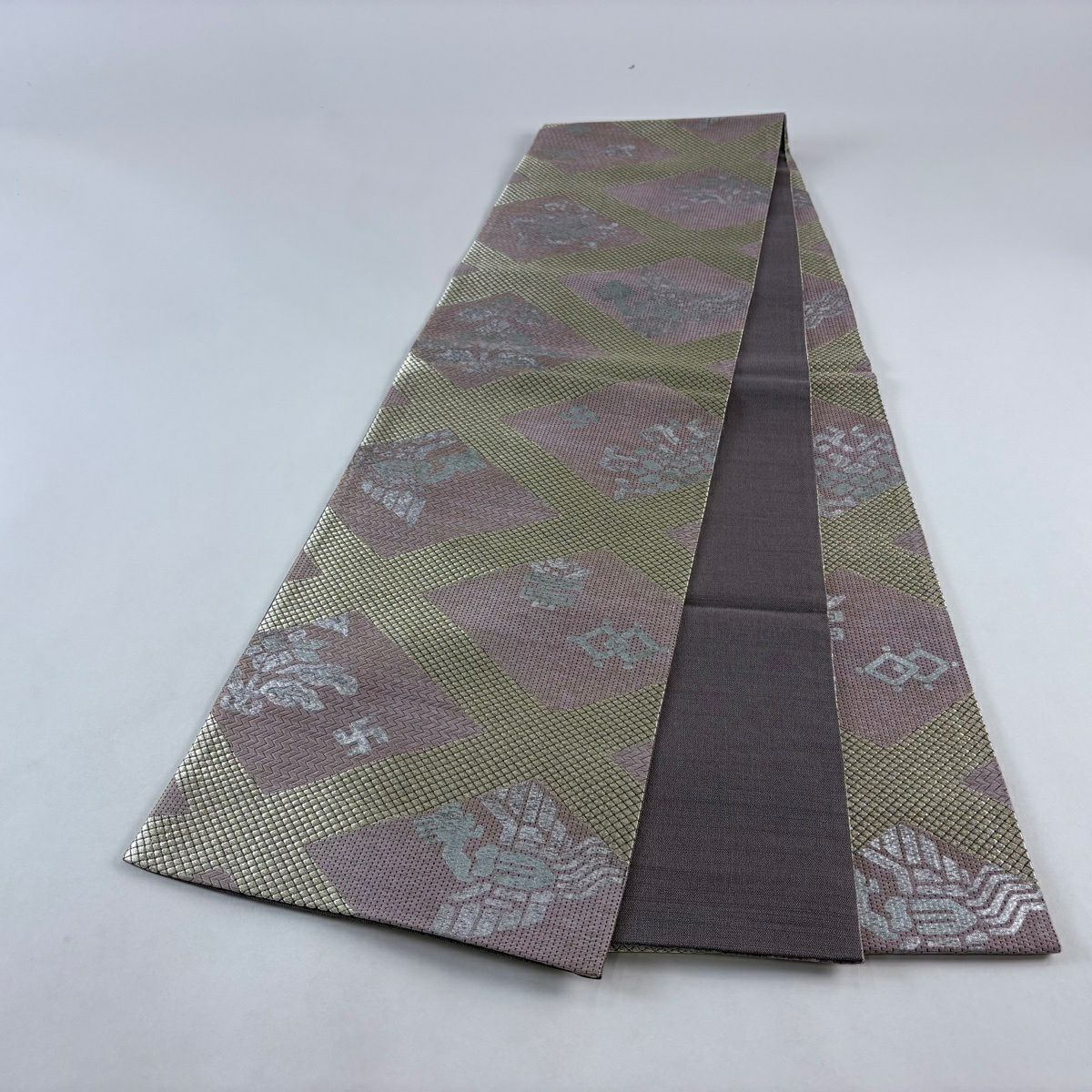 50%OFF 袋帯 名品 関西仕立て 若竹結文錦 銀糸 箔 薄小豆 全通 正絹 K50