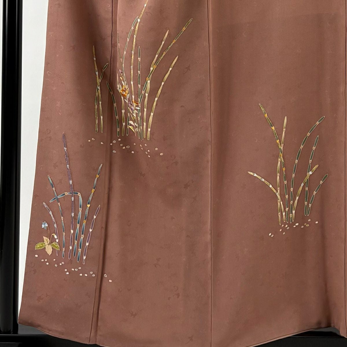 訪問着 身丈156cm 裄丈66.5cm M 袷 中澤晃介 落款あり 草花 流水 ぼかし 薄小豆 正絹 秀品