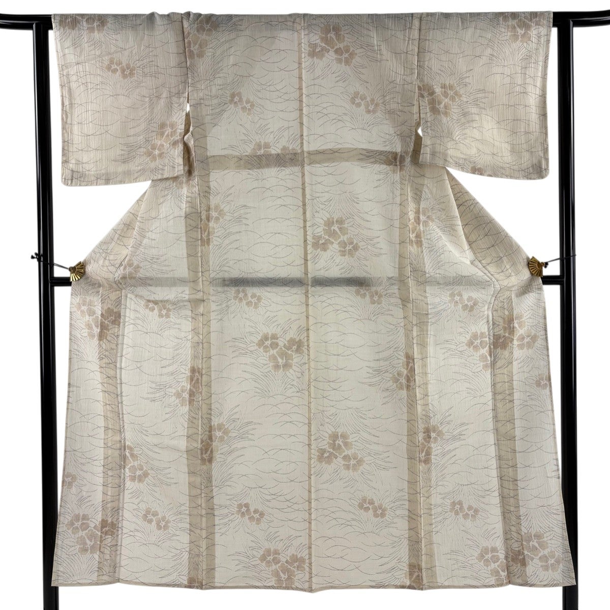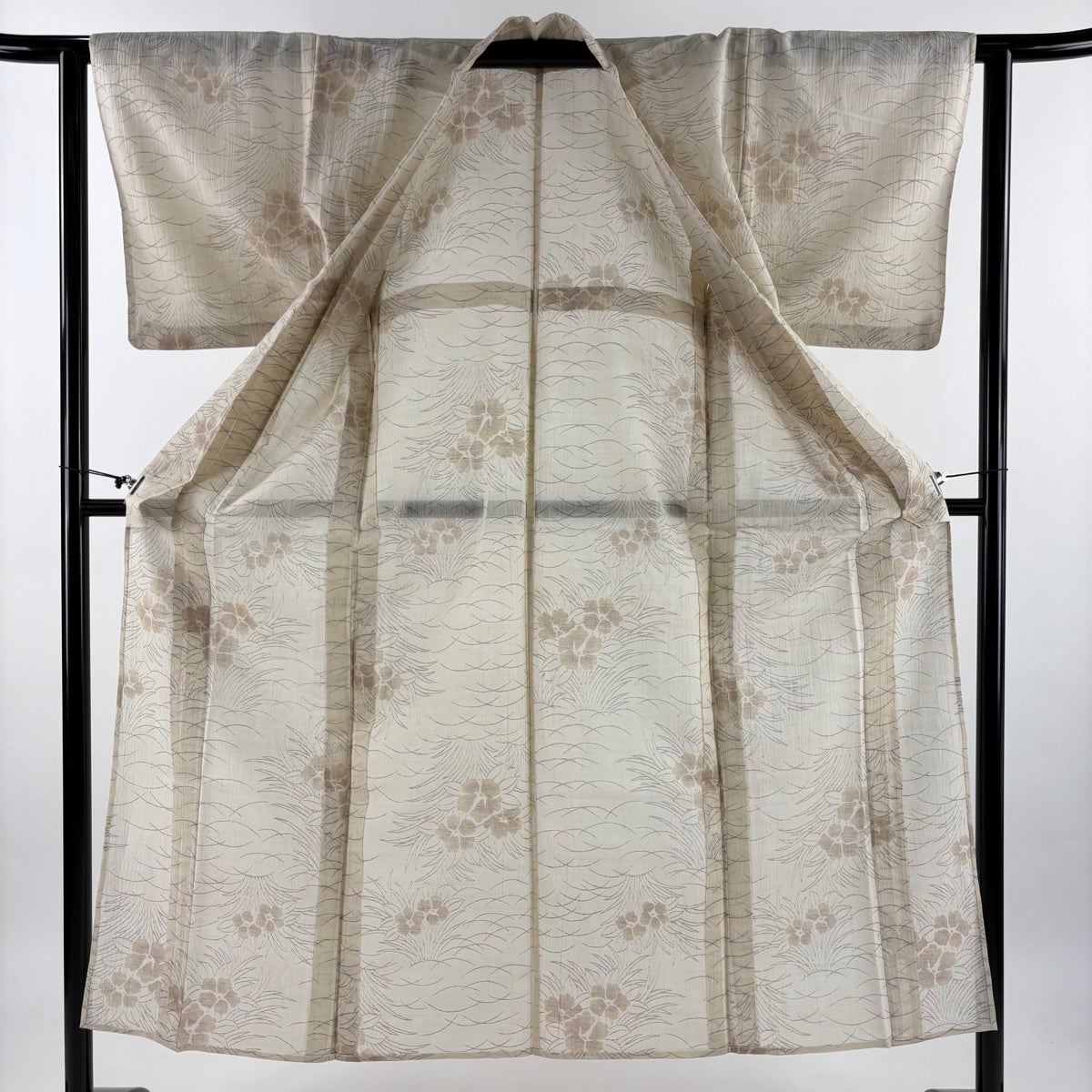 小紋 身丈165cm 裄丈69cm L 薄物 川村久太郎 夏紬地 落款あり 草花 波 ベージュ 正絹 名品