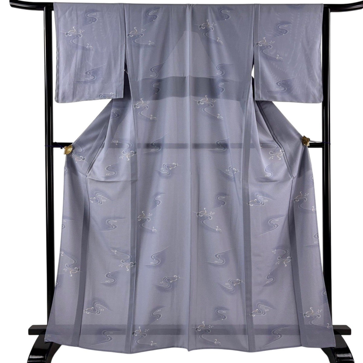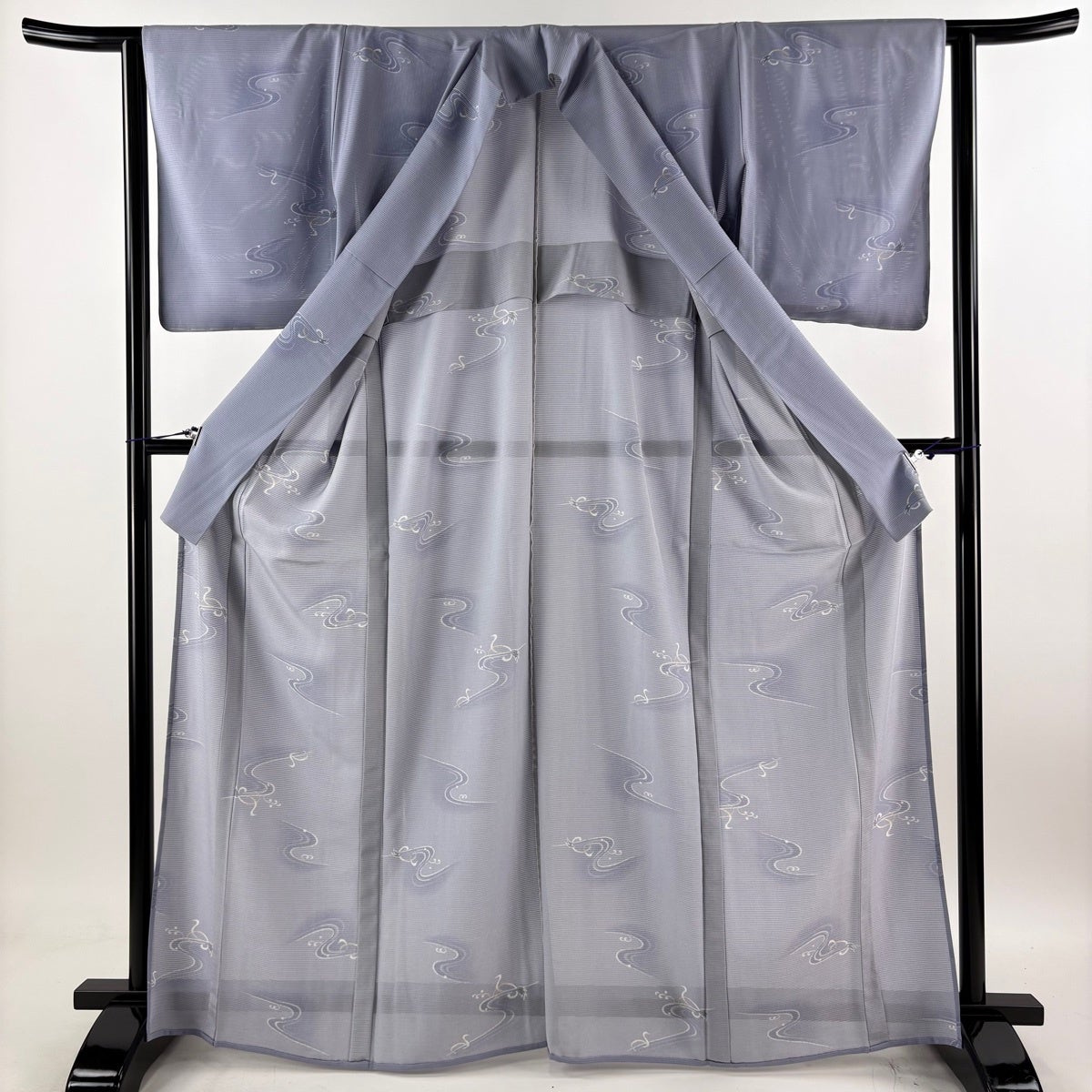 訪問着 身丈162.5cm 裄丈63cm S 薄物 洗える着物 絽 笹 梅 青灰色 化繊 優品