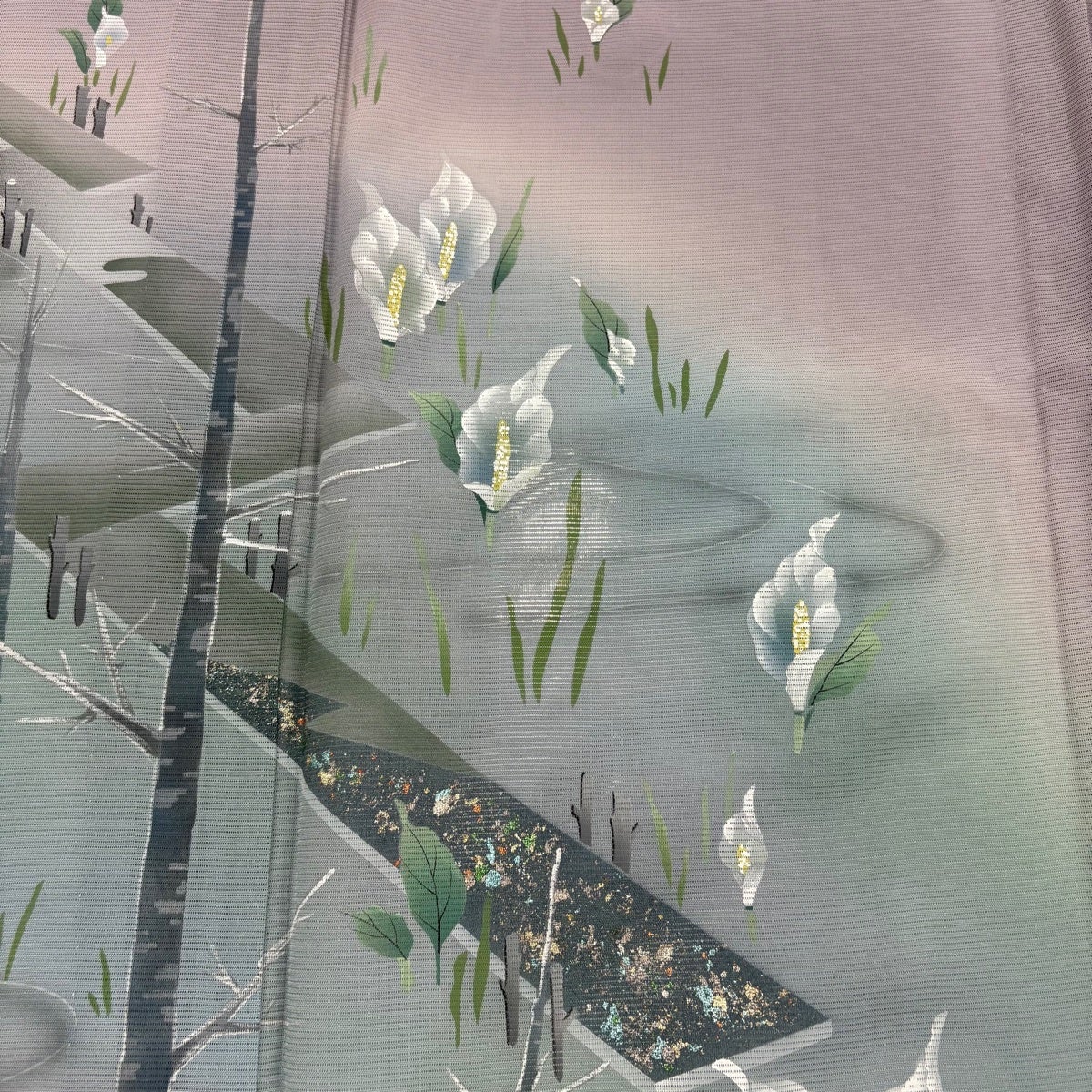 付下げ 身丈162.5cm 裄丈64cm M 袷 落款あり 花 鹿子 金彩 螺鈿 薄紫 正絹 秀品