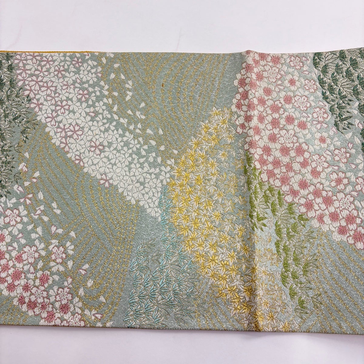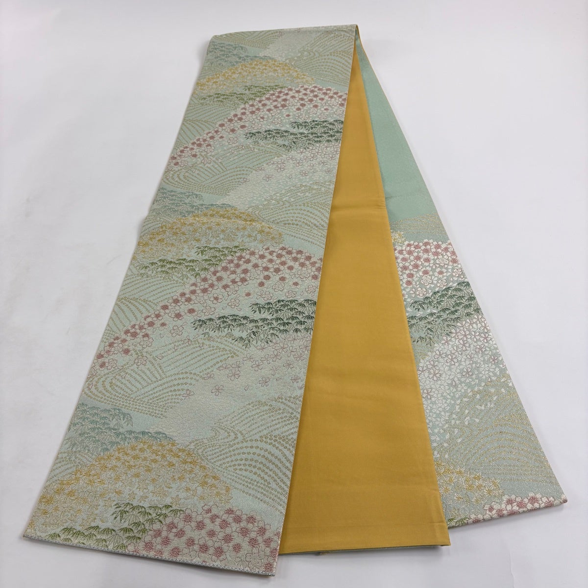 袋帯 秀品 桜 笹 金糸 銀通し 薄緑 六通 正絹