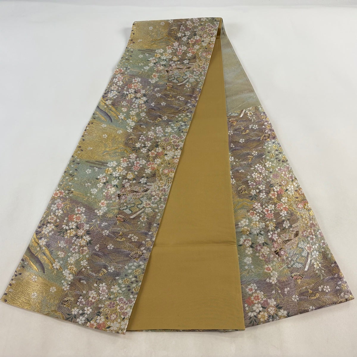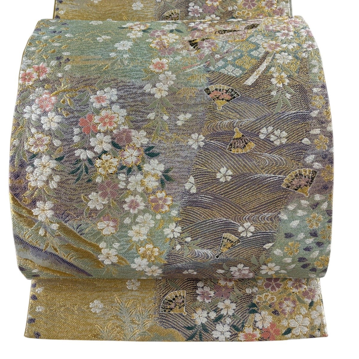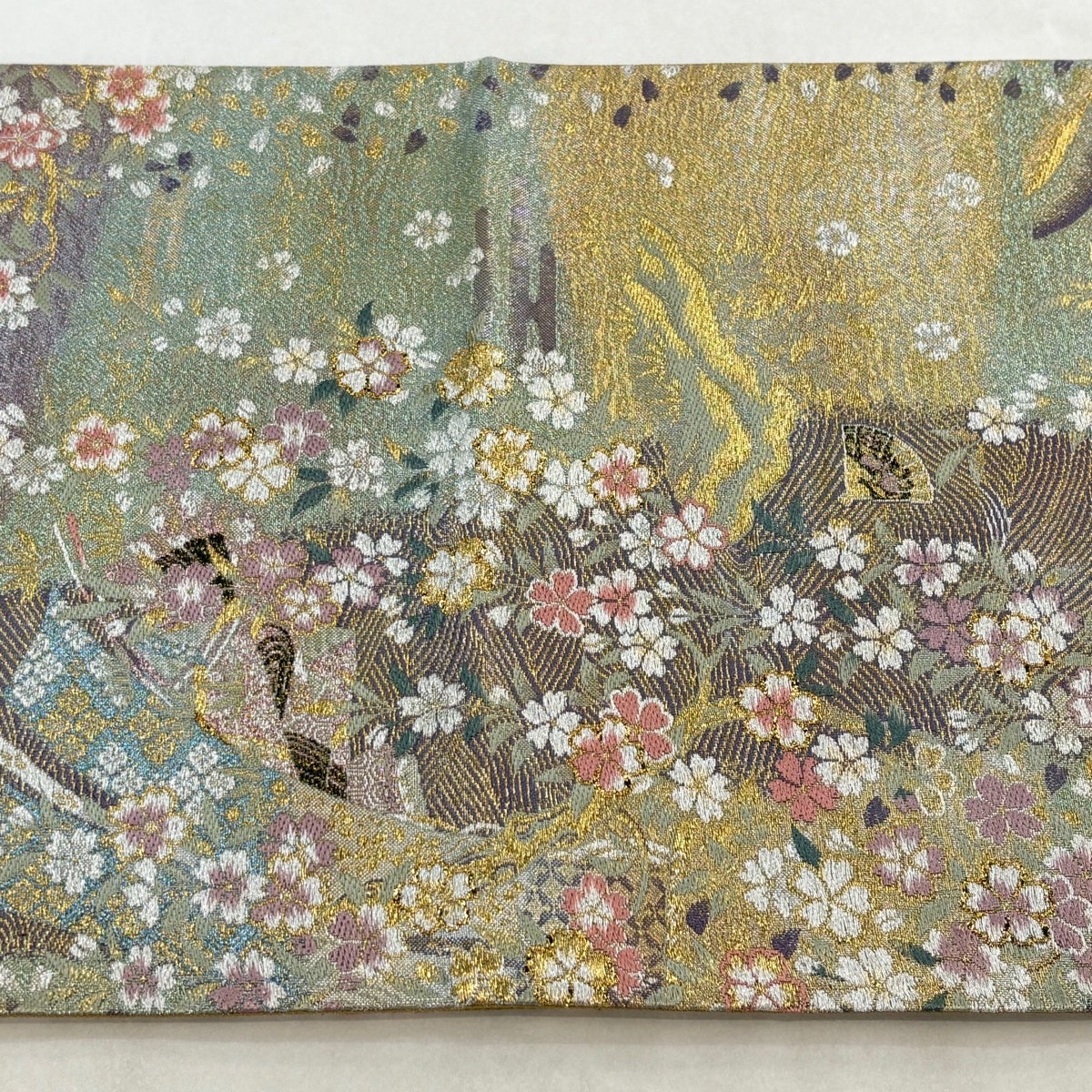 30%OFF 袋帯 秀品 桜 流水 金銀糸 箔 薄緑 六通 正絹 K30